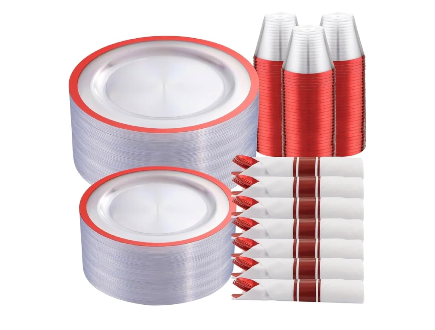 This set includes disposable plates, cups, and napkins, all with a red trim accent. It's suitable for parties or events where cleanup is a priority. The tableware is made of plastic.