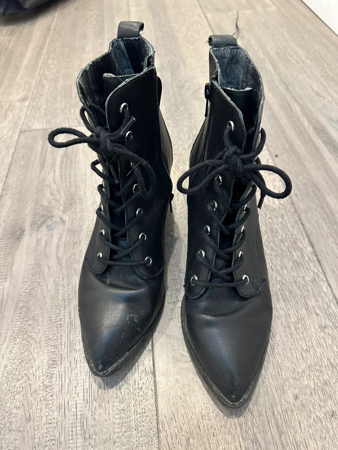 Selling a pair of black leather lace-up heeled boots. They're in good condition and have a fabric lining. Perfect for adding a bit of edge to your outfit!