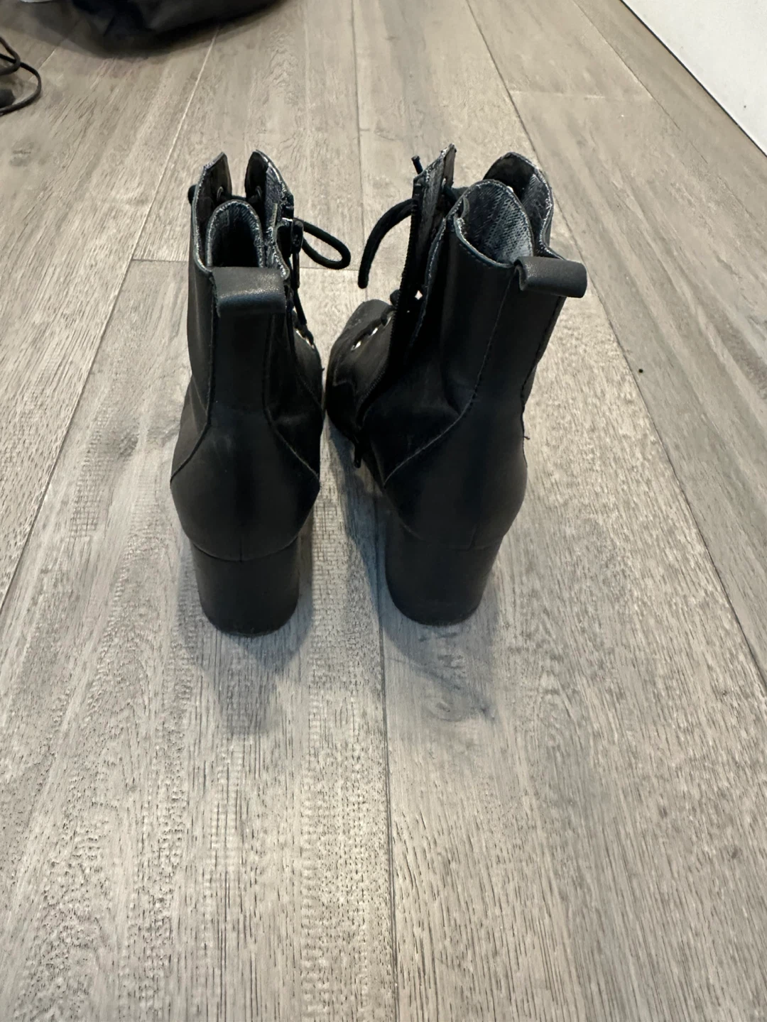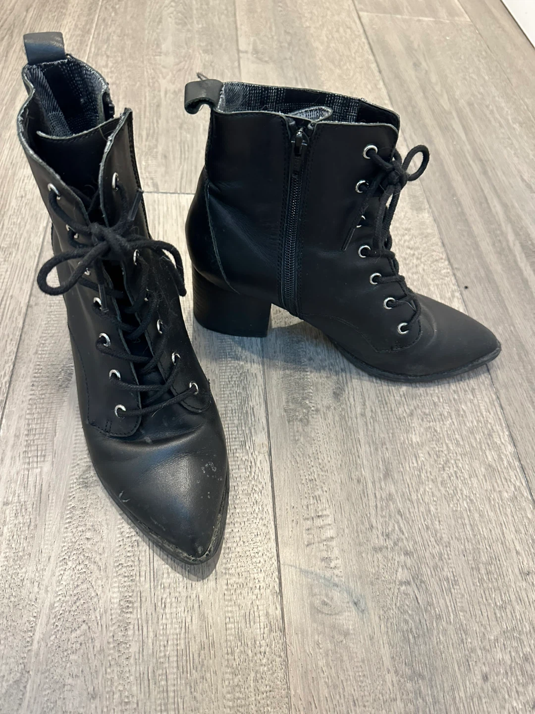 Selling a pair of black leather lace-up heeled boots. They're in good condition and have a fabric lining. Perfect for adding a bit of edge to your outfit!