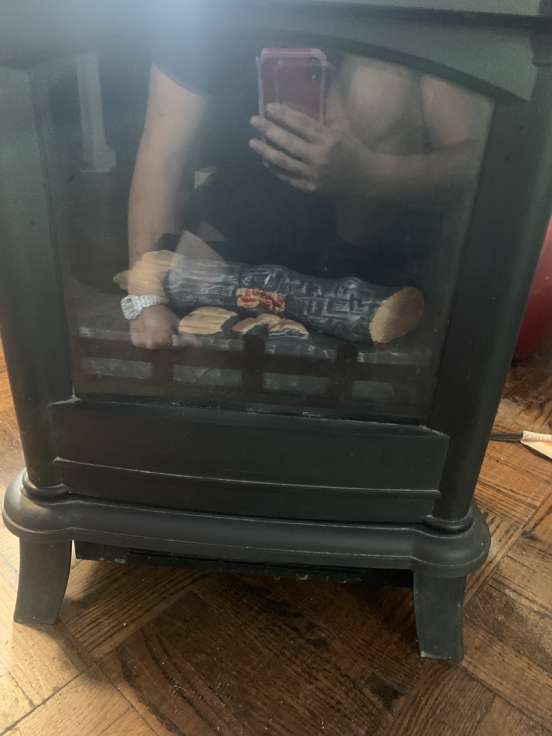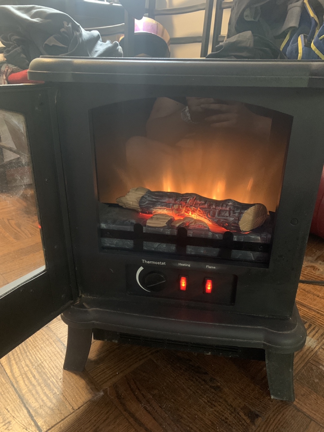 Electric fireplace heater with thermostat, heating, and flame settings. It's in good condition and ready to keep you warm!