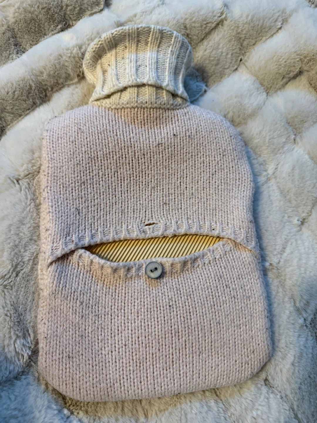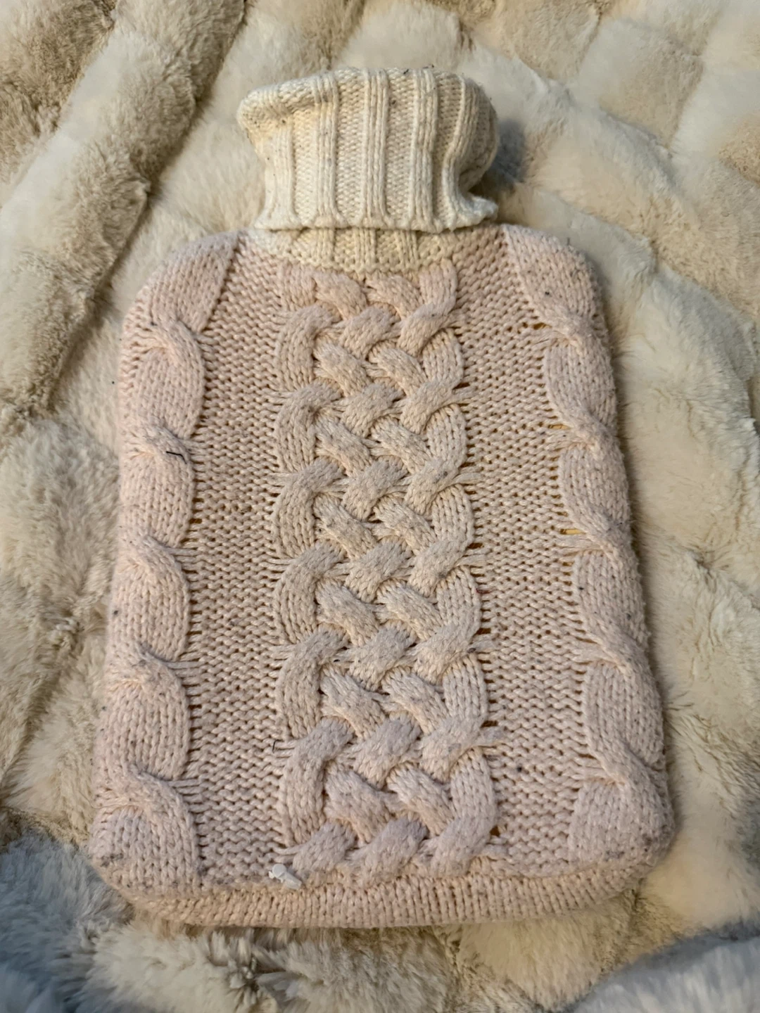 Cozy knit cover for a hot water bottle, featuring a cable knit pattern and a turtleneck design. It has a button closure for easy access. Made from a soft knit material.