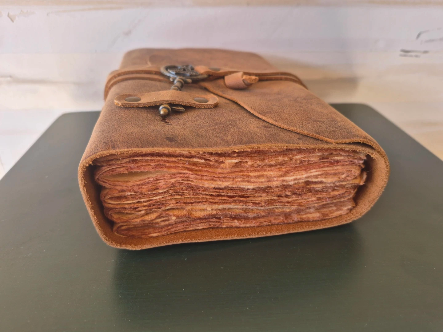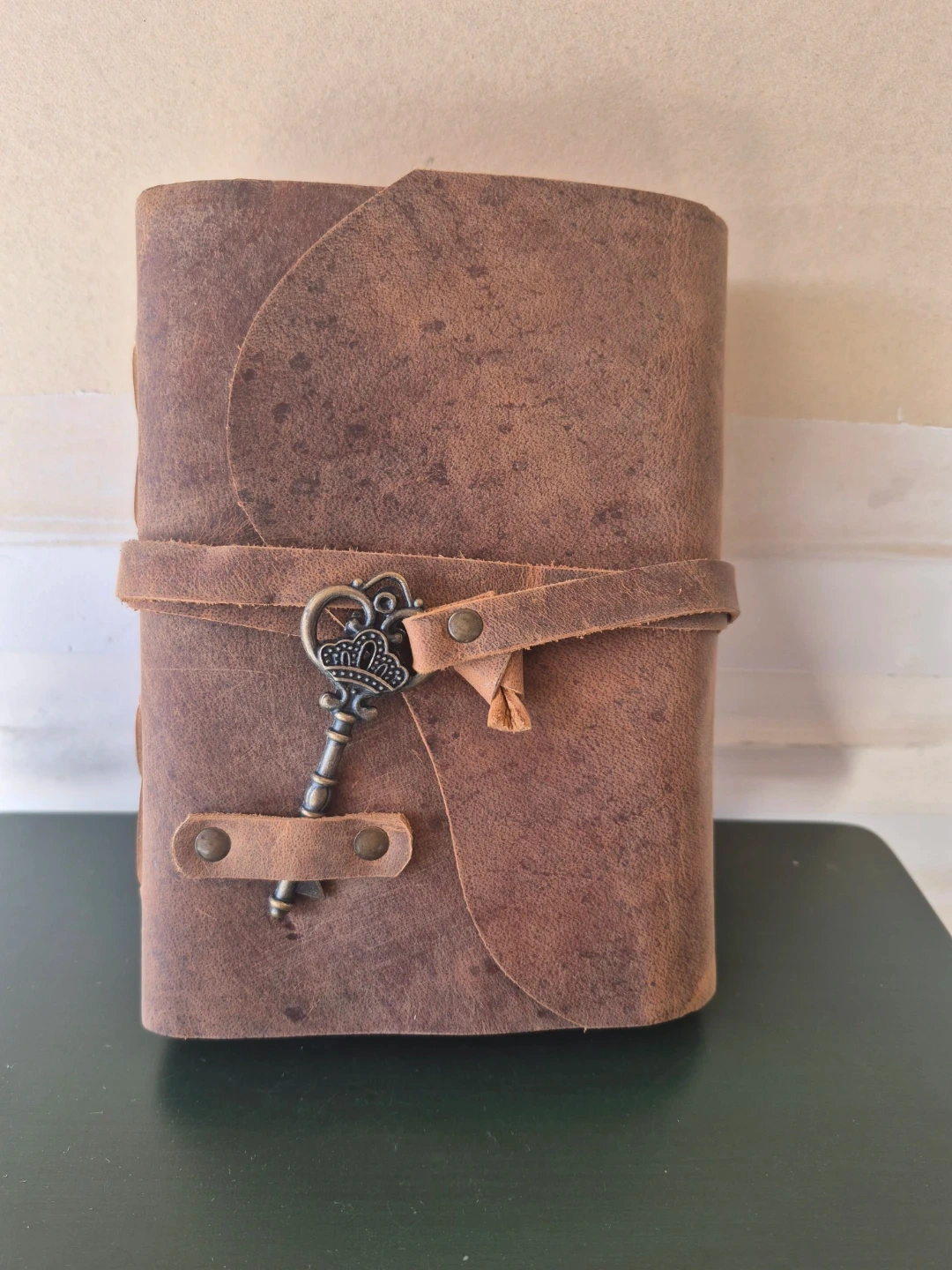 A beautiful, rustic leather-bound journal is ready for your thoughts. It features handmade paper pages and a unique key closure. This journal's vintage style makes it a charming companion for writing or sketching.