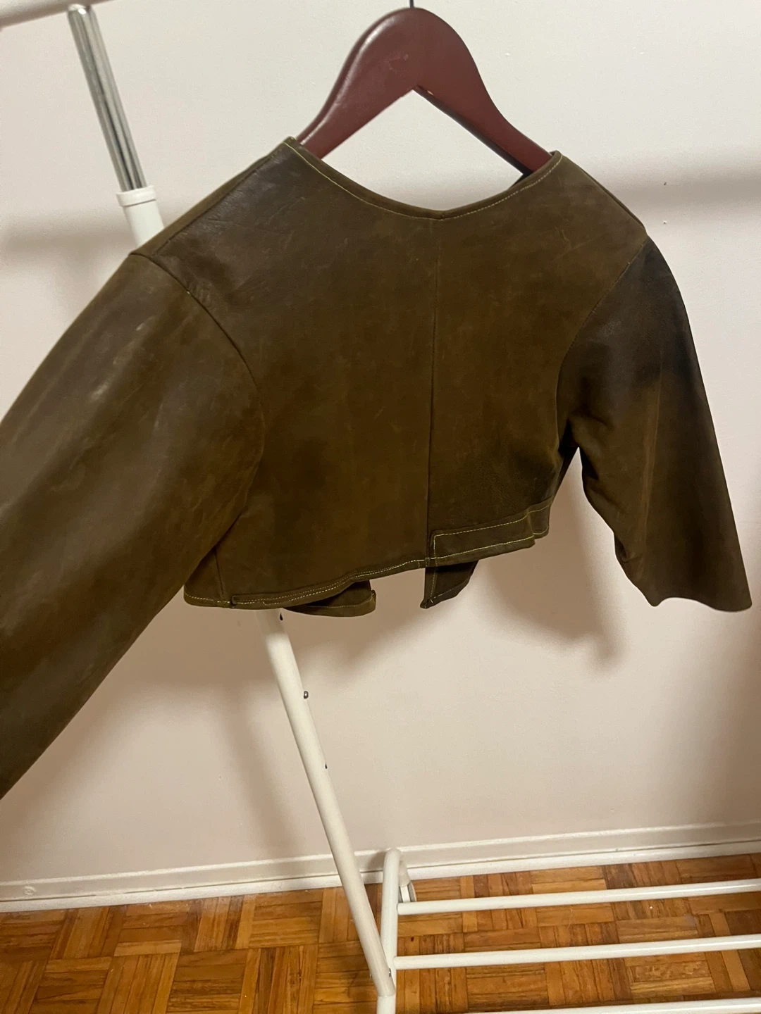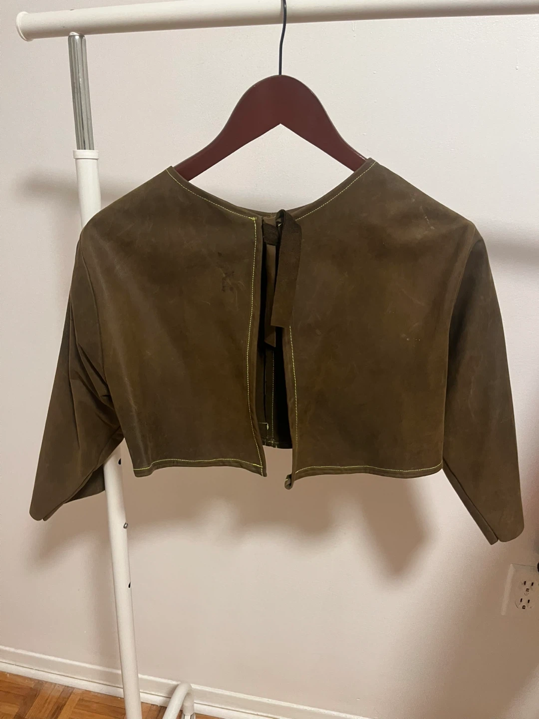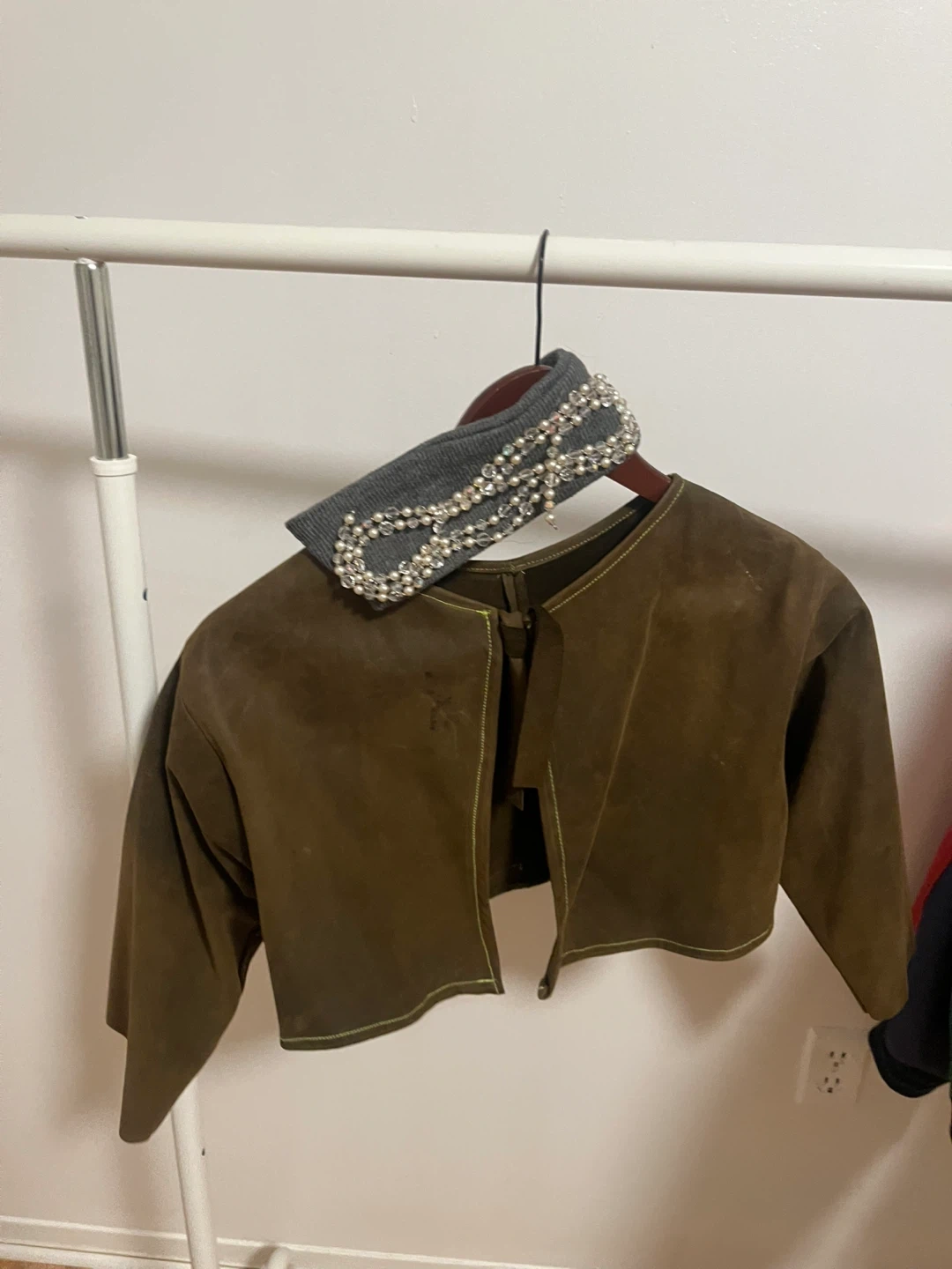 Selling a stylish brown suede bolero jacket! This unique piece is perfect for adding a touch of flair to any outfit. The material is soft and comfortable, and the cropped design makes it a versatile layering option. It's in good condition with a cool, vintage vibe
