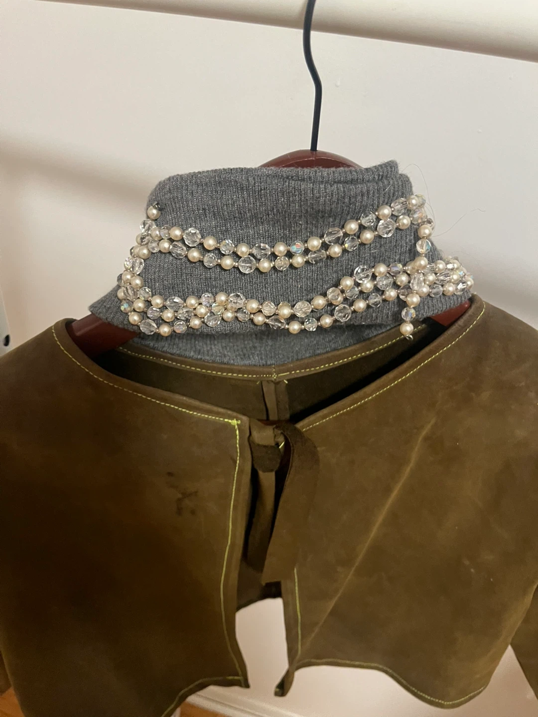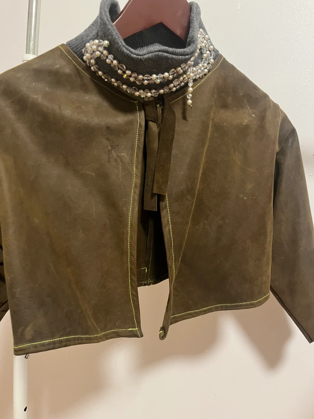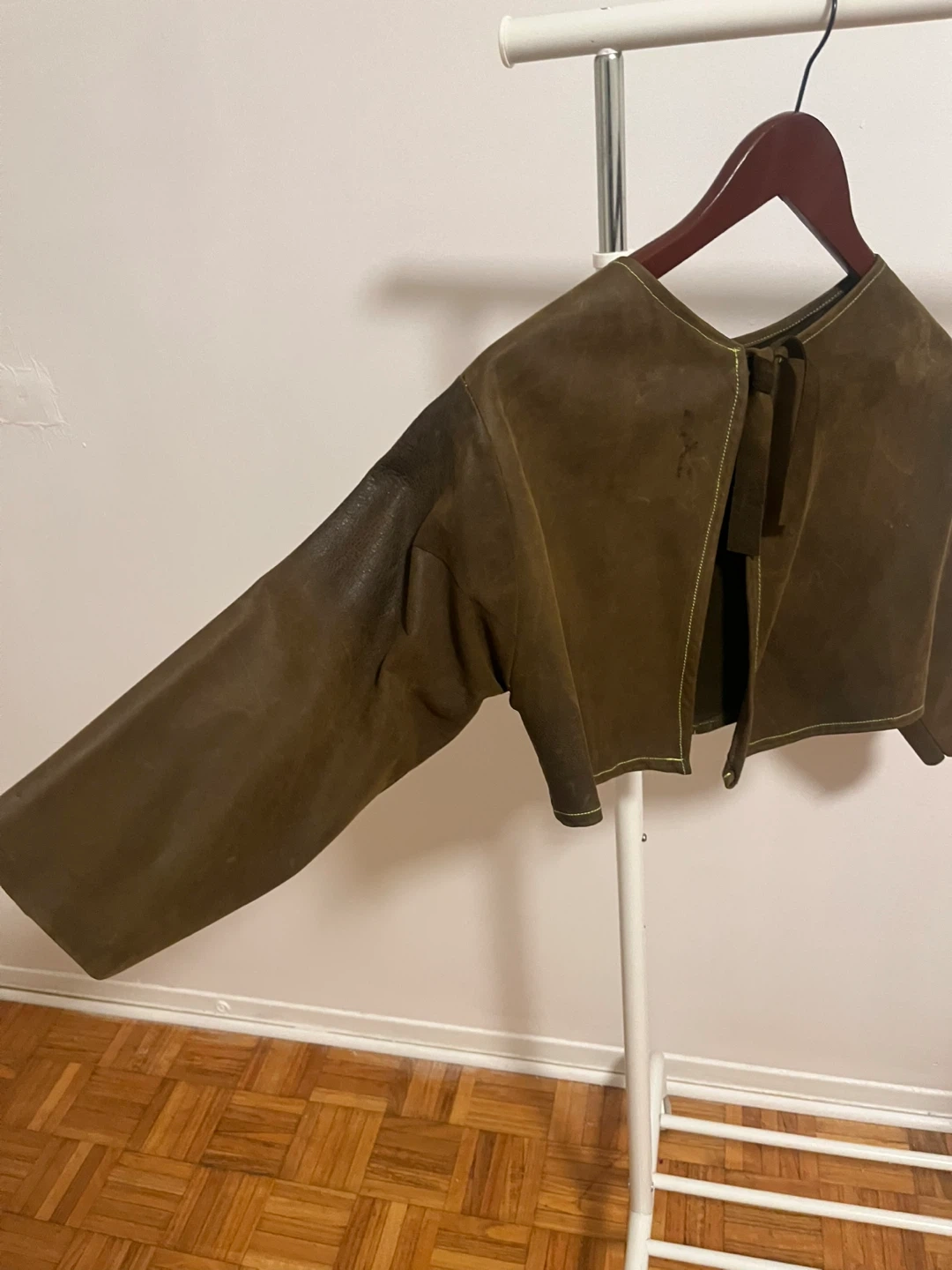 Selling a stylish brown suede bolero jacket! This unique piece is perfect for adding a touch of flair to any outfit. The material is soft and comfortable, and the cropped design makes it a versatile layering option. It's in good condition with a cool, vintage vibe