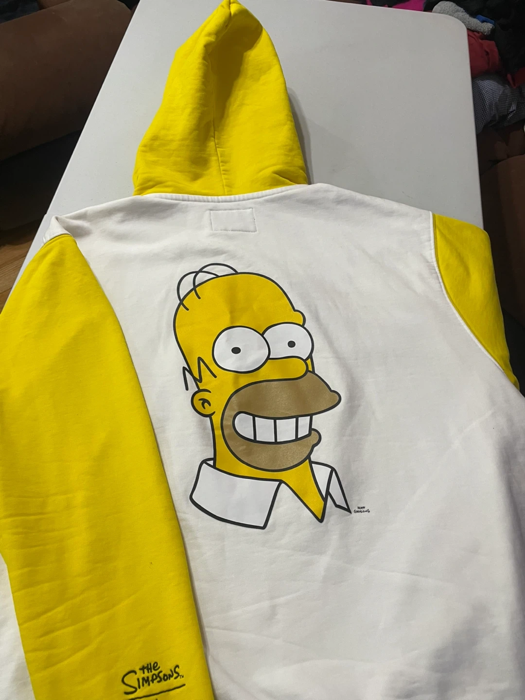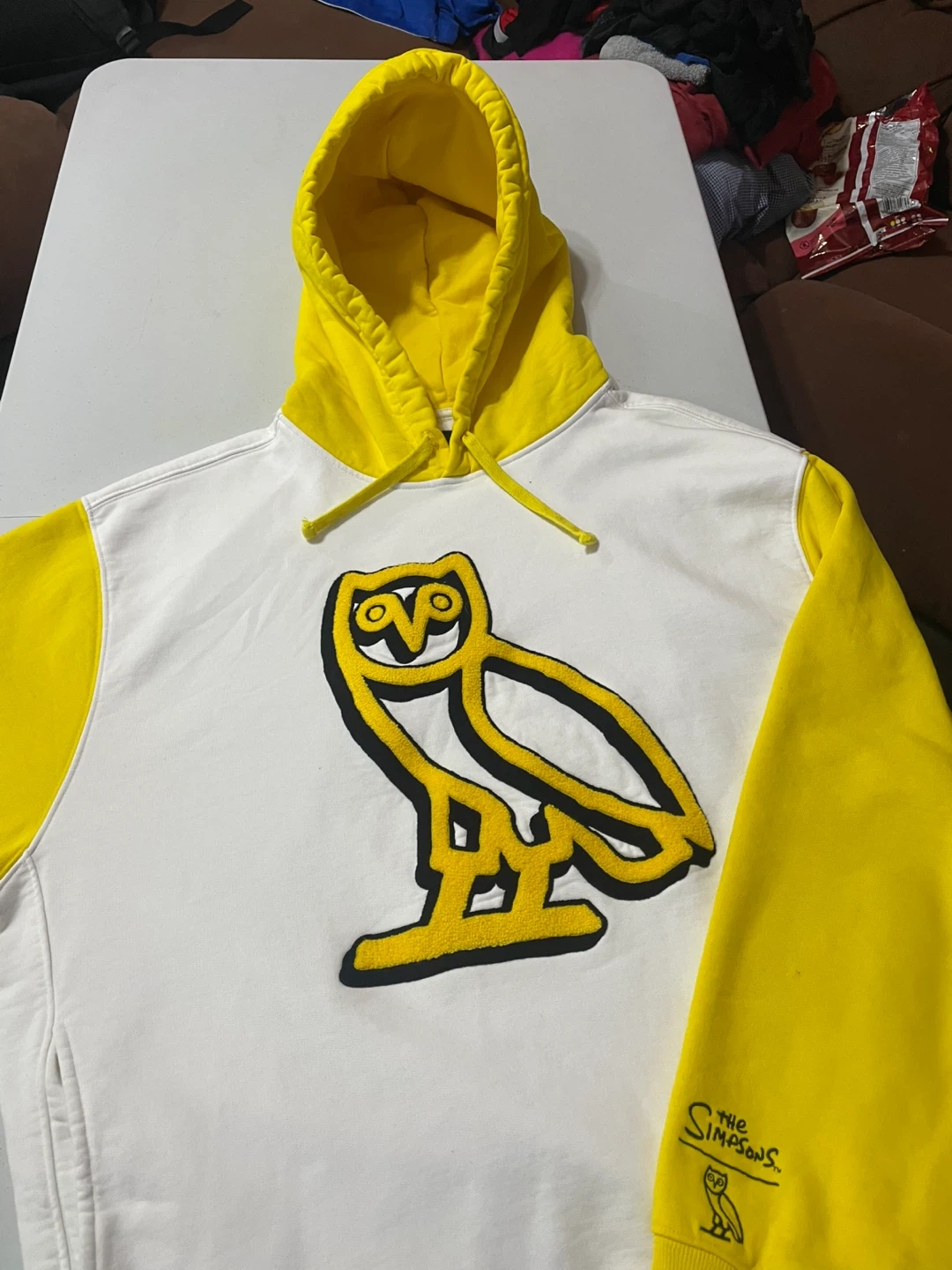 White and yellow hoodie featuring the OVO owl and Homer Simpson graphic. It's got a comfortable fit and a bold design. Perfect for fans of The Simpsons!