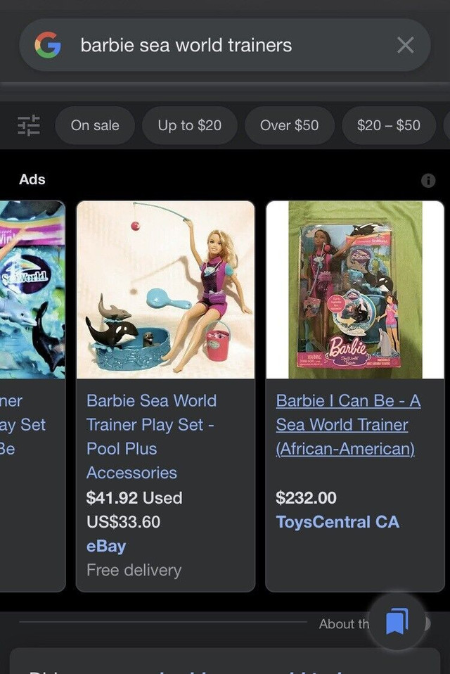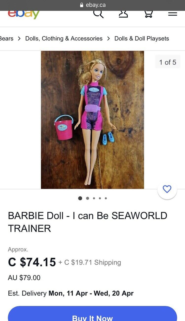 1 / 71 / 7Buy & SellBarbie Sea world trainersBarbie Sea world trainers$100Two Discontinued Barbie sea world trainers from sea world. Price comparison in photos Condition: Used - Like new For Sale By: OwnerWHERE TO MEETCheck LocationView MapSELLERverifiedNatalieDouglasdale892 reviews0 chats·0 favorites·8 viewsSEND CHAT TO SELLERHi Natalie! I’m interested in your listing.Hi Natalie! I’m interested in your listing.Get the Karrot app to chatSign In to chat