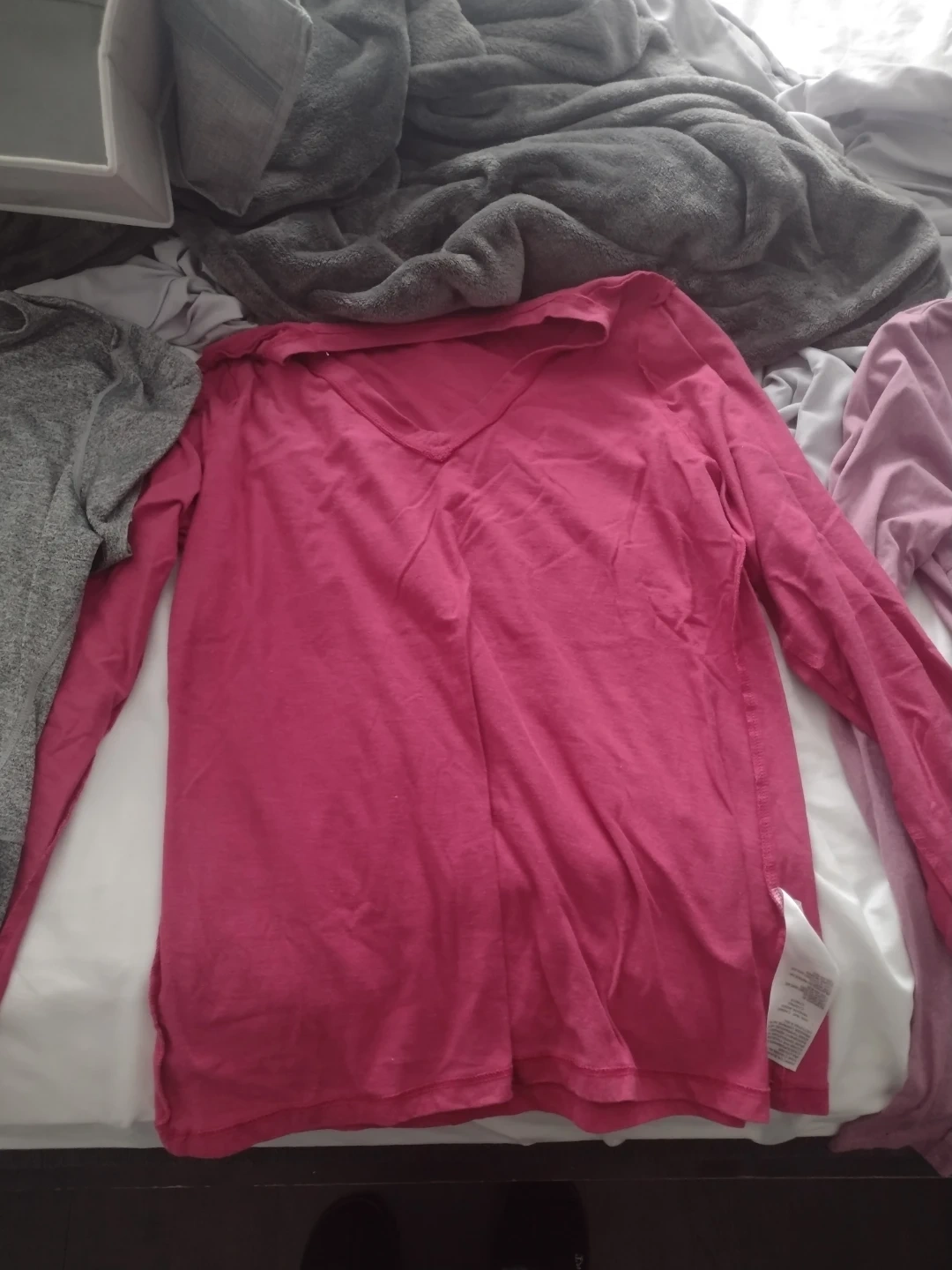 This women's long sleeve top comes in a vibrant pink colour. It's a V-neck style with a casual fit. Made from a soft, breathable fabric.