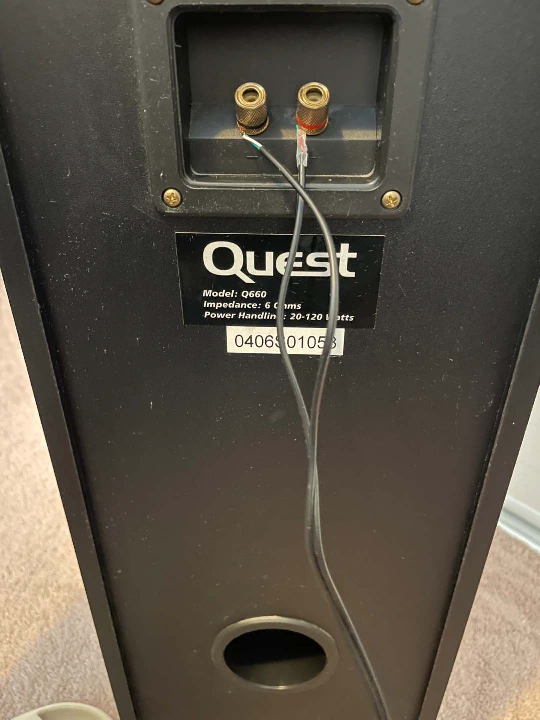 Selling a pair of Quest floor standing speakers. These are large, black tower speakers with dual mid-range drivers and a tweeter. They connect with standard speaker wire terminals at the back. Great for a home theatre setup or music listening!