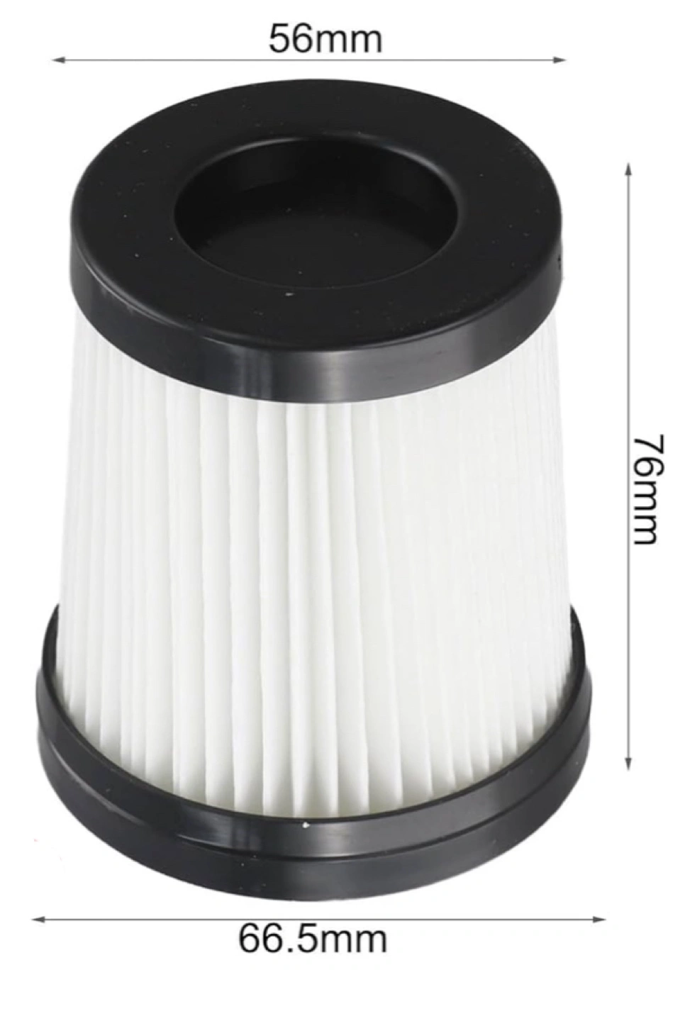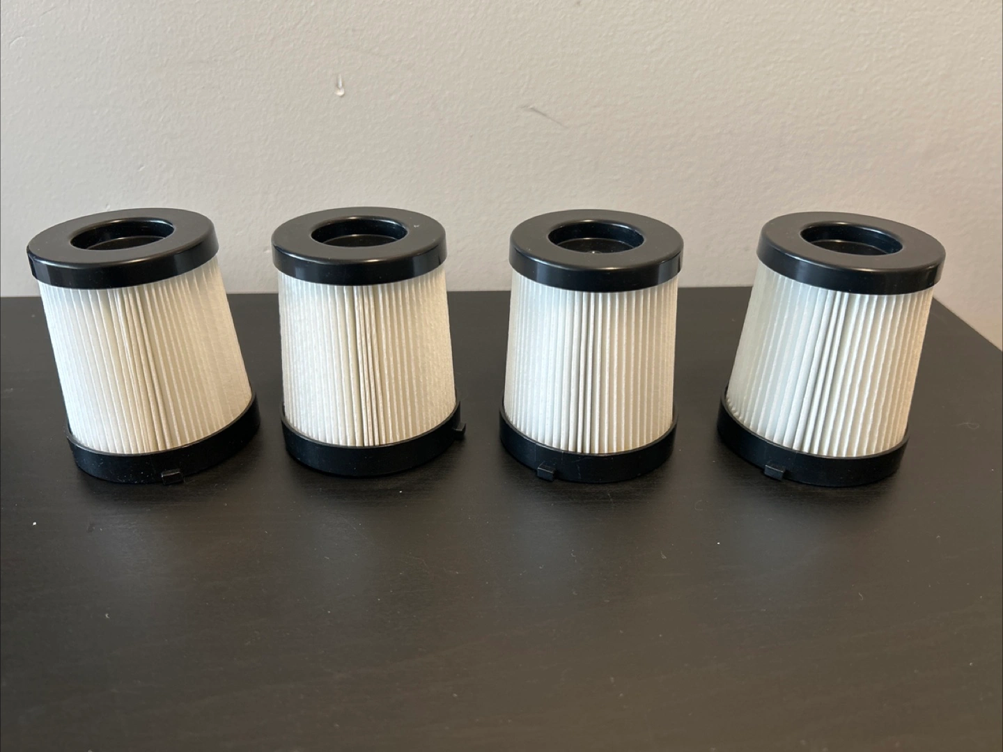 Set of four replacement vacuum filters with pleated white paper elements and black plastic rims. They're designed to fit specific vacuum models. Keep your home clean and air fresh!