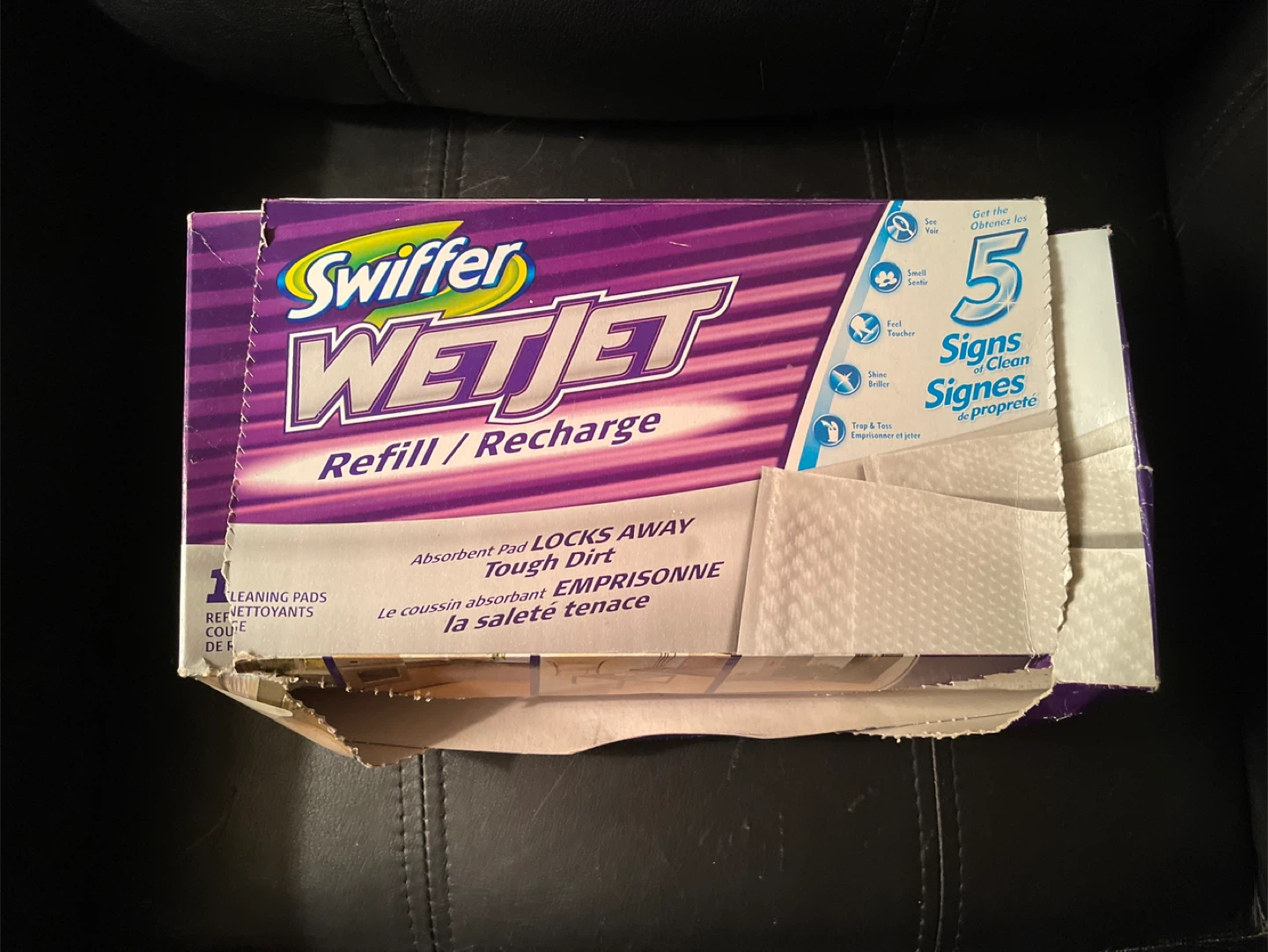 Open Swiffer WetJet Refill pack with eight pads remaining. This refill is designed to lock away tough dirt. It helps you see, smell, feel, and shine to get 5 signs of clean!