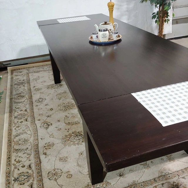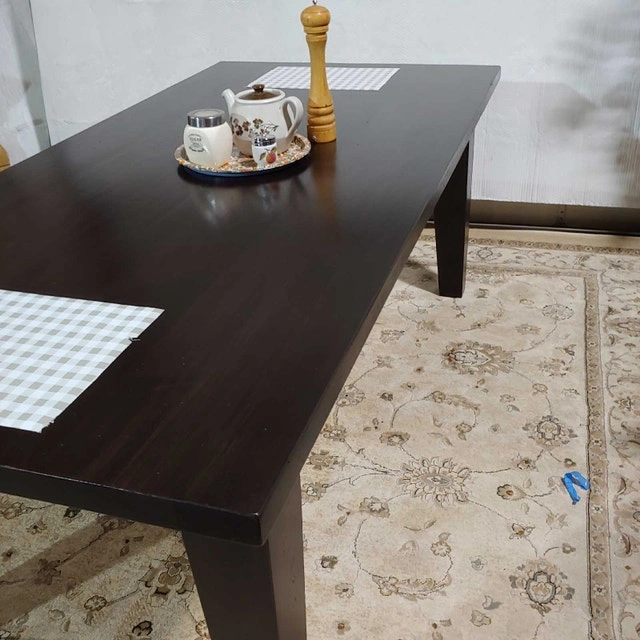 Selling a massive solid pine dining table in a modern "Parsons" style with a dark espresso finish. This table is huge—starting at 7 feet long and extending to nearly 10 feet—making it perfect for large families or hosting holiday dinners. Despite its size, because it is solid pine (not heavy particleboard), it is surprisingly lightweight and easier to move. Key Features: End Extensions: Includes two separate extension leaves that manually attach to the ends of the table via guide holes. You can add one or both depending on how many guests you have. Huge Capacity: Comfortably seats 8 people when closed, and extends to seat 10–12 people easily. Solid Wood: Made of solid pine. There are no veneers to peel or chip over time. Design: Clean, modern square-leg design that fits almost any decor. Note: The extension leaves are stored separately from the table when not in use. Dimensions: Length (Closed): 83 inches (approx. 7 feet) Length (Fully Extended): 116 inches (9 feet, 8 inches) Width: 40 inches Height: Standard dining height Condition: Structurally solid and sturdy. Cosmetic Note: As this is soft pine with a dark stain, the tabletop has small dents and character marks throughout from normal family use. This is cosmetic only; the wood itself is solid. Pickup in Waterloo.