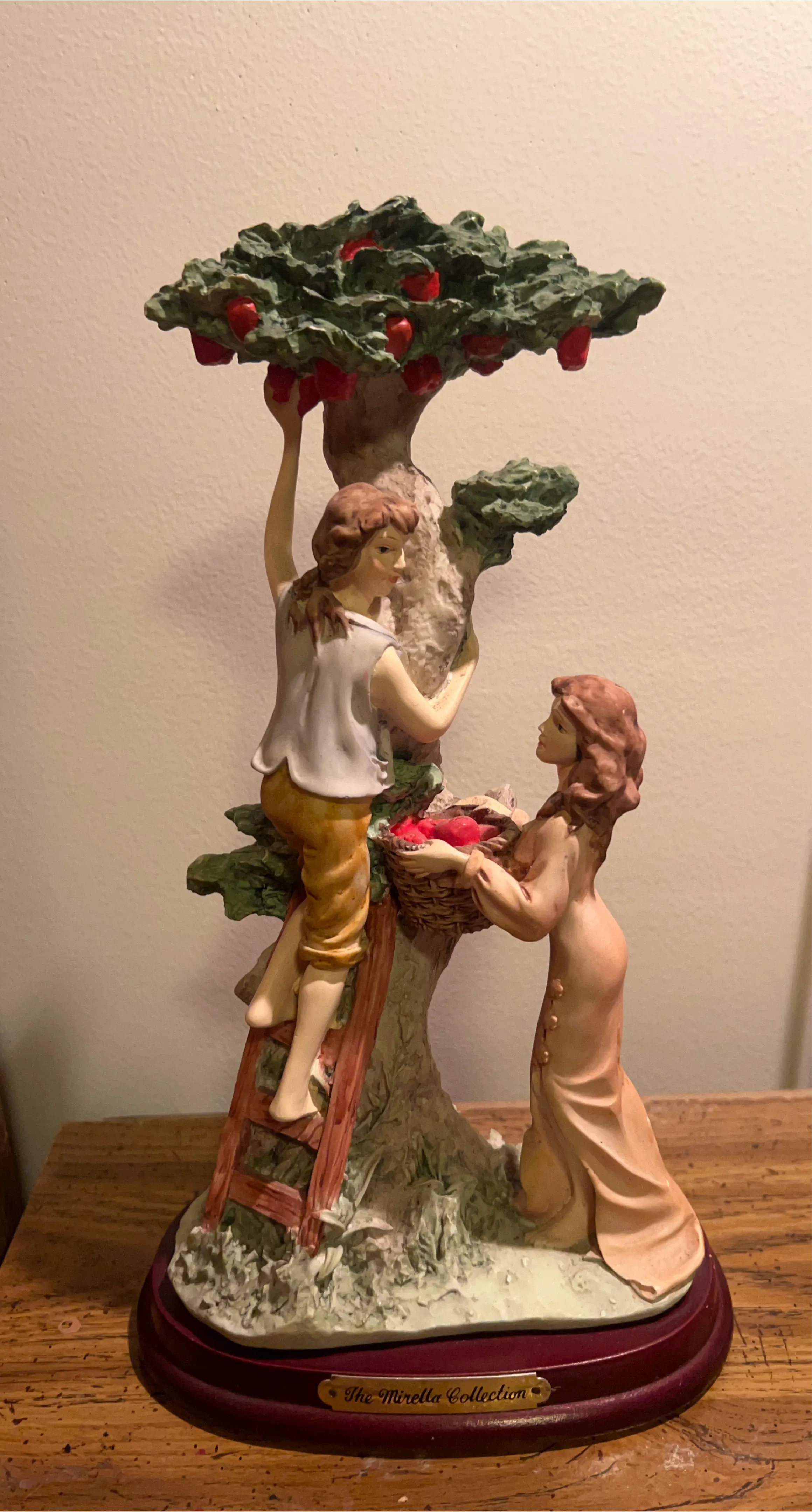 This decorative figurine depicts a charming apple-picking scene. It features two figures, one on a ladder reaching for apples and another holding a basket. The base has a label that reads "The Mirella Collection".