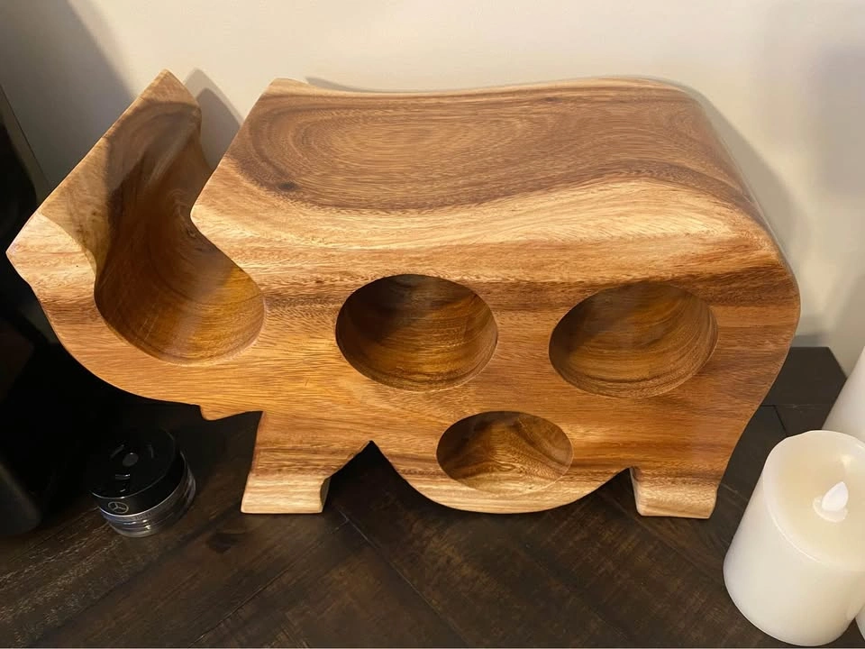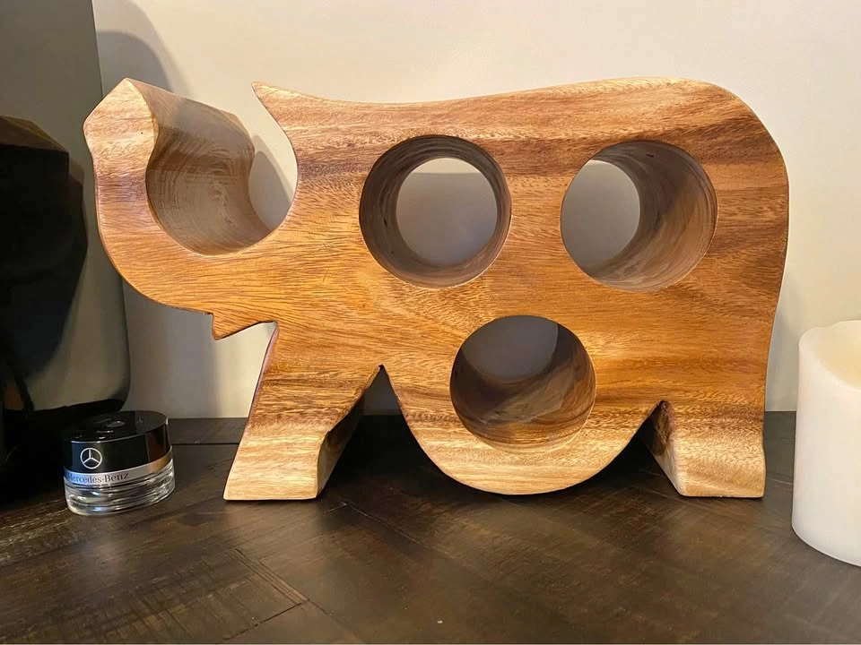 15It’s in good condition. Made out of real wood, natural beauty of the design, heavy. 15” long x 7” wide x 9” tall