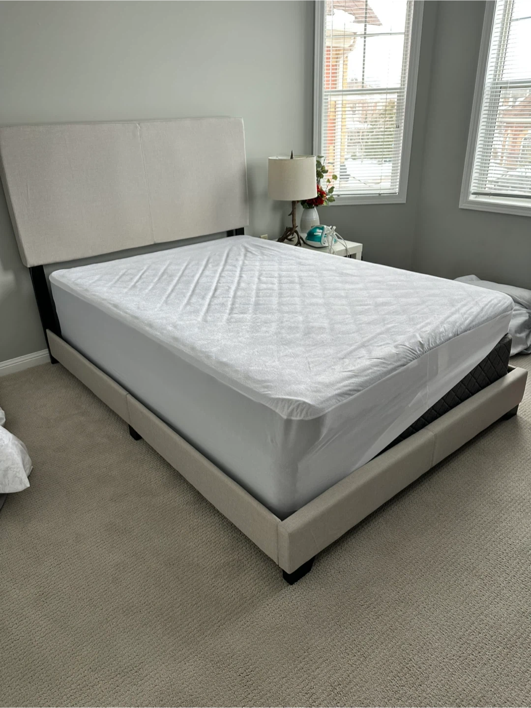 This upholstered bed frame comes with a matching headboard. It's a full/double size and features a sturdy slat system. Also comes with a mattress and box spring purchased from The Brick approximately 2 years ago, barely used and always had a protecter on it - this bed was for our guest room.