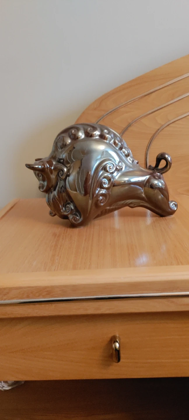This decorative metal bull figurine has a polished silver finish. It's intricately detailed with swirling patterns. A nice accent piece for a desk or shelf!