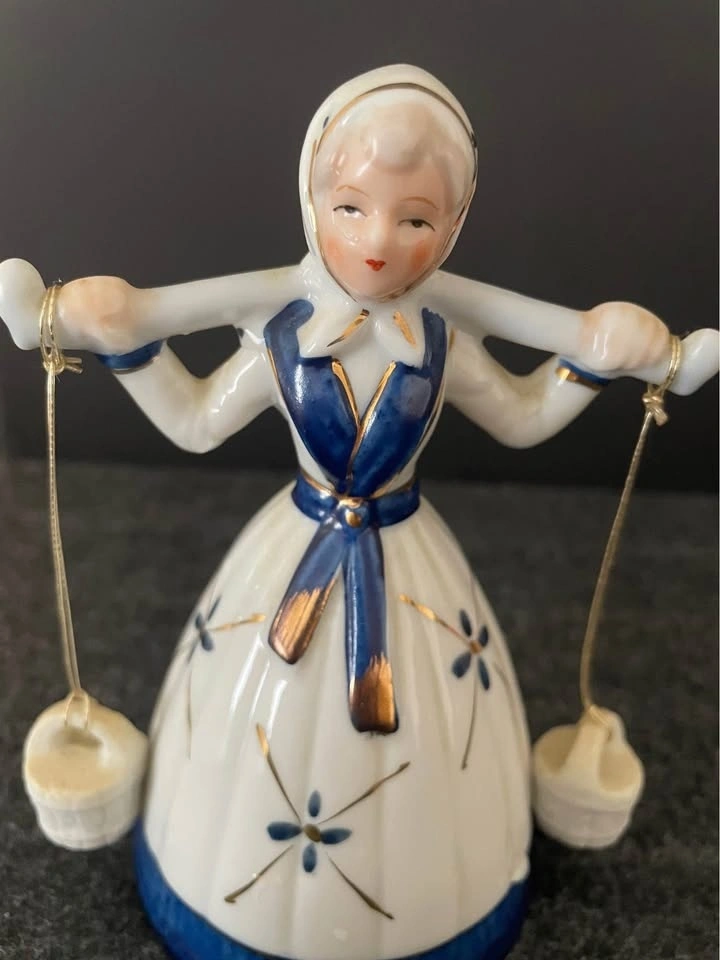 Vintage English Bisque Figurine « Dutch Milkmaid Carrying Buckets » 5 inches high, hand painted gold trim, lovely sound! This cutie is a perfect addition to any collection.