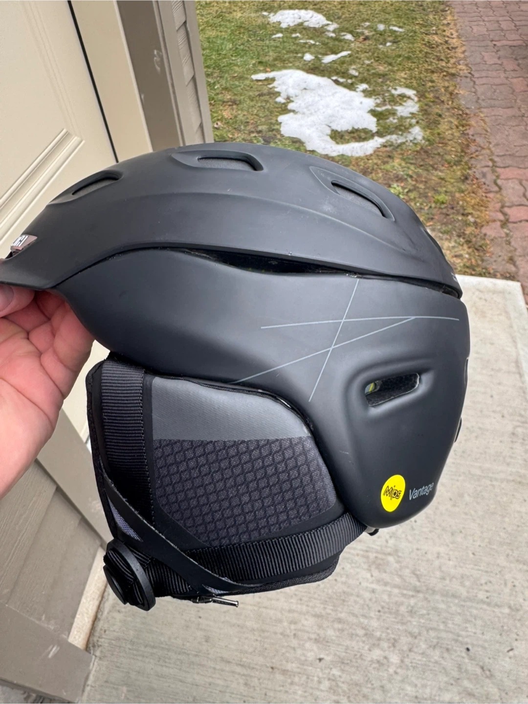 This black Smith Vantage MIPS ski helmet is a size LG. It weighs 550g.