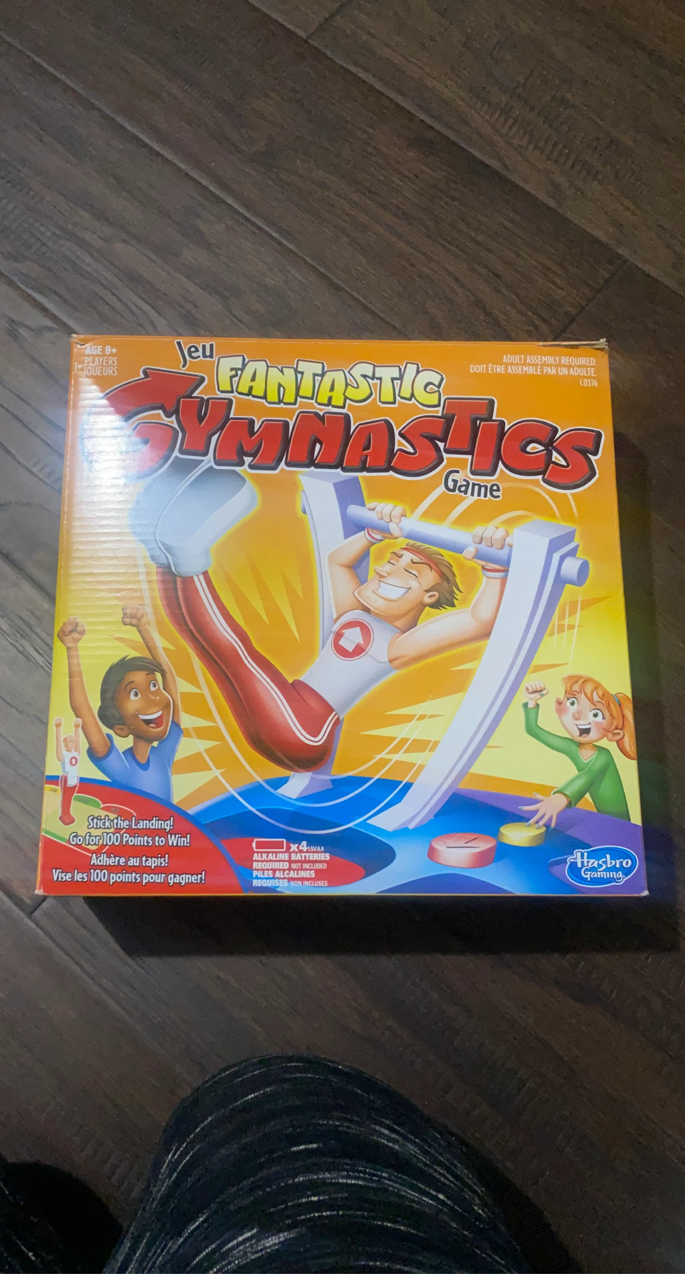 This is the Fantastic Gymnastics board game by Hasbro Gaming. It's for ages 8 and up. Alkaline batteries are required but not included.