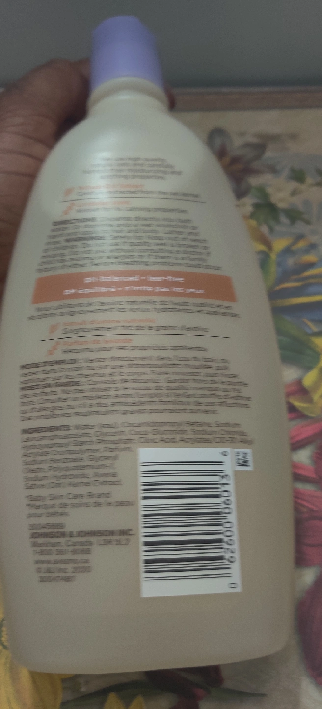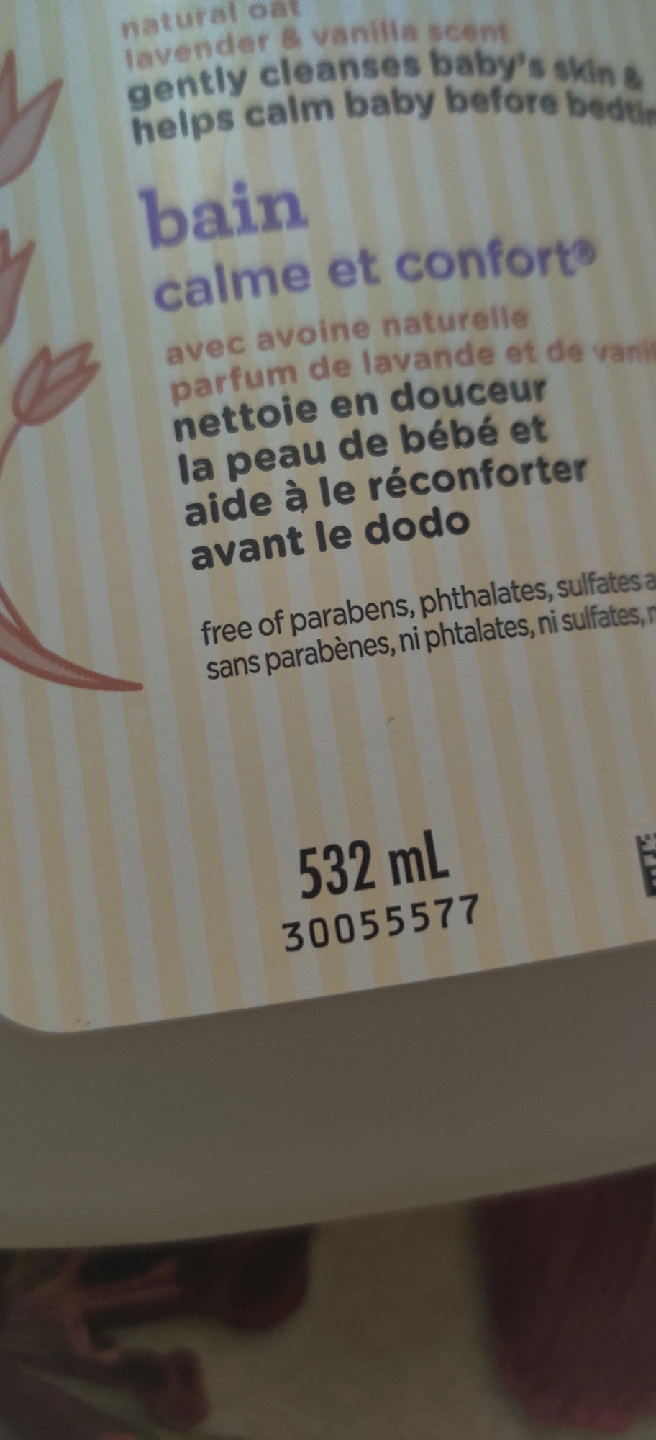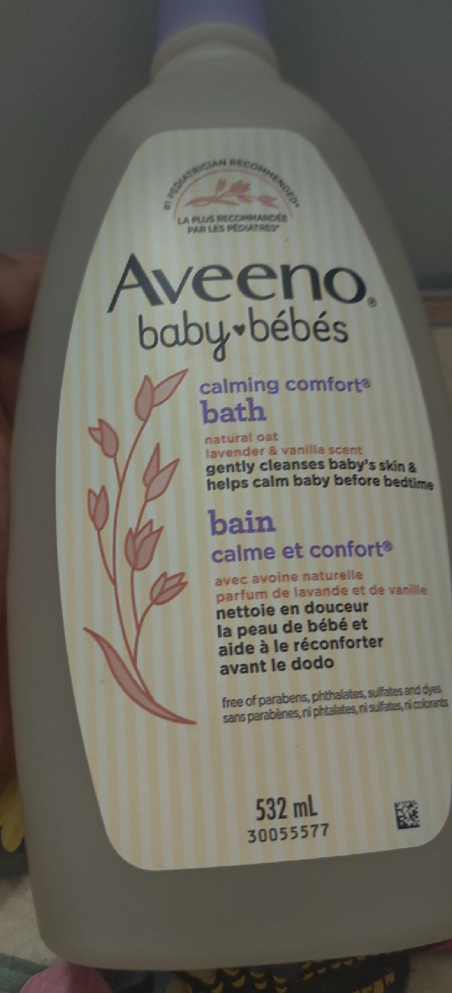 Aveeno Baby Calming Comfort Bath, with natural oat, lavender and vanilla scent. Gently cleanses baby's skin and helps calm baby before bedtime. 532 mL bottle