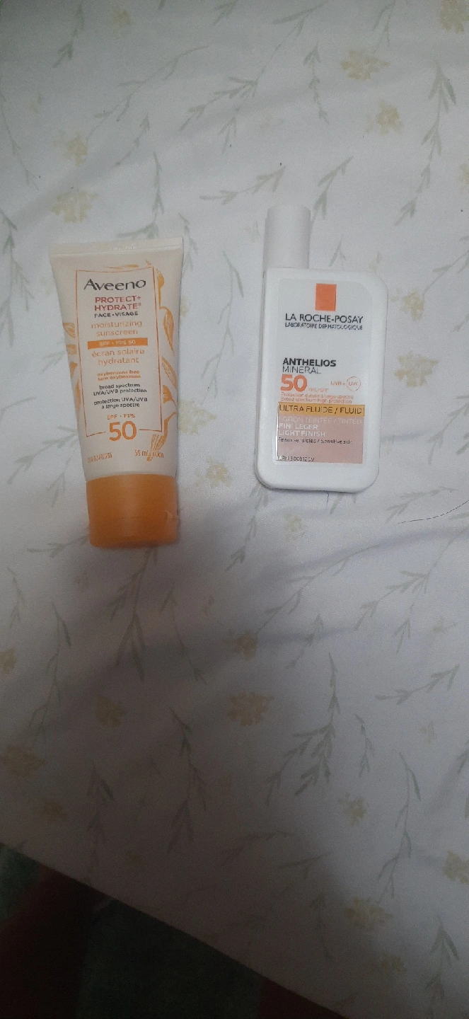 15Selling these sunscreens together! You'll get: - Aveeno Protect + Hydrate Face Moisturizing Sunscreen SPF 50 - La Roche-Posay Anthelios Mineral Ultra Fluid Tinted Sunscreen SPF 50 Both are great for broad spectrum UVA/UVB protection and are suitable for sensitive skin