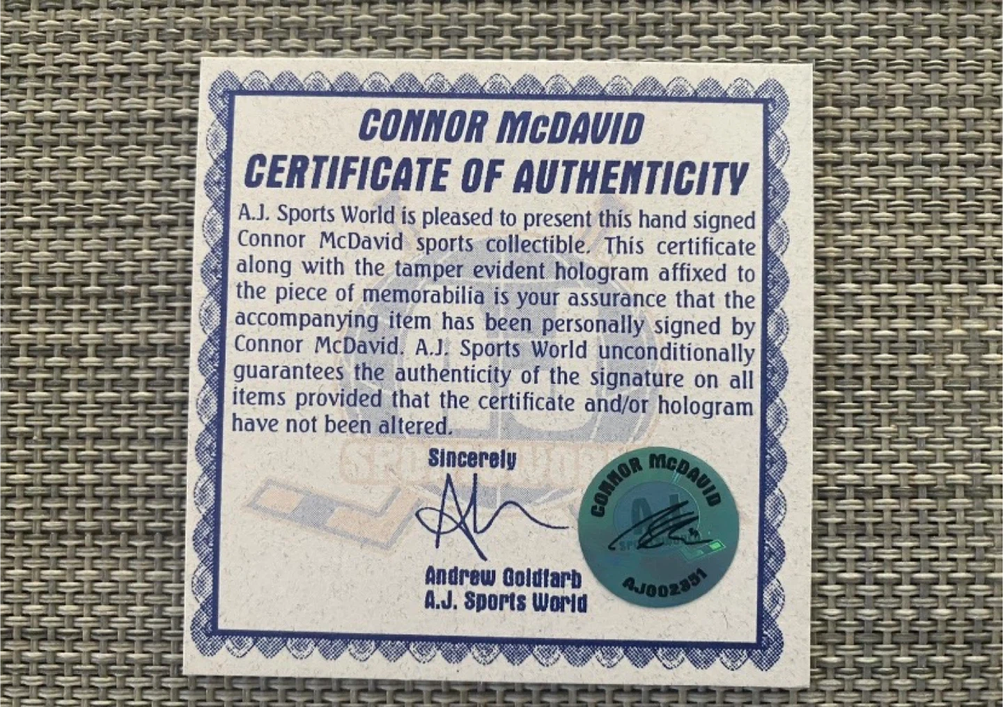 The photo comes with a hologram sticker from A.J. Sports in the bottom right hand corner along with a COA with the same hologram sticker on it.