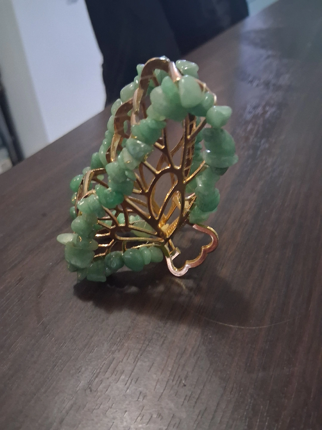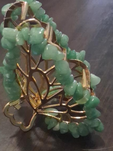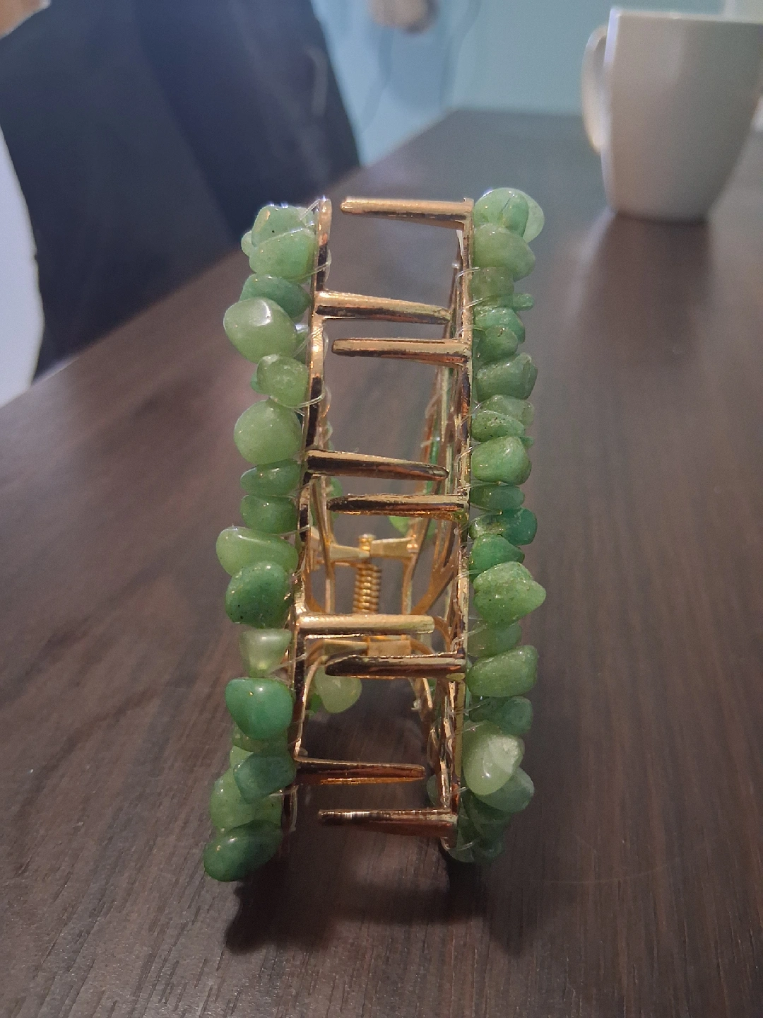 353Here's a lovely hair claw clip featuring aventurine, a variety of quartz! It has a gold-tone metal frame with green aventurine stones attached. It's a unique and stylish accessory to keep your hair in place