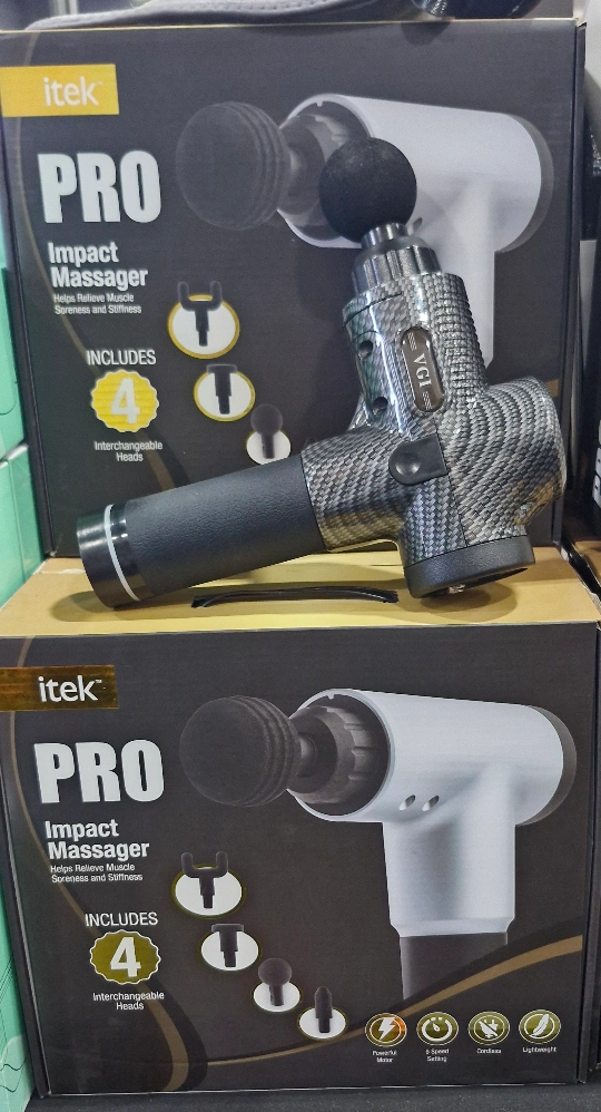 I'm selling an Itek Pro Impact Massager. It helps relieve muscle soreness and stiffness. It includes 4 interchangeable heads and is lightweight