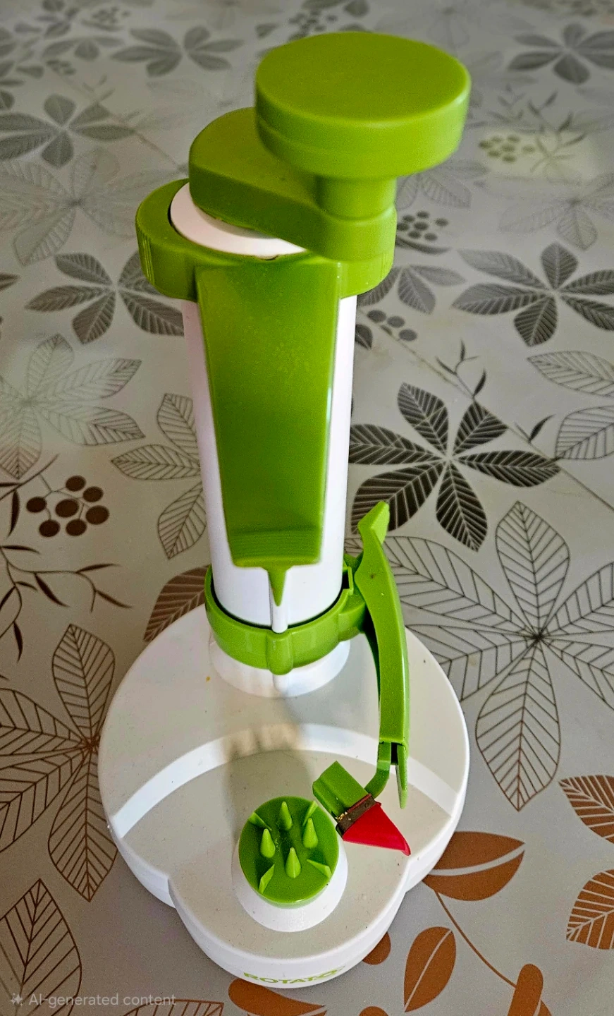 This Rotato is designed to peel, core, and slice apples quickly. It's made of durable plastic and features a crank handle for easy operation. Perfect for making apple pies or snacks!