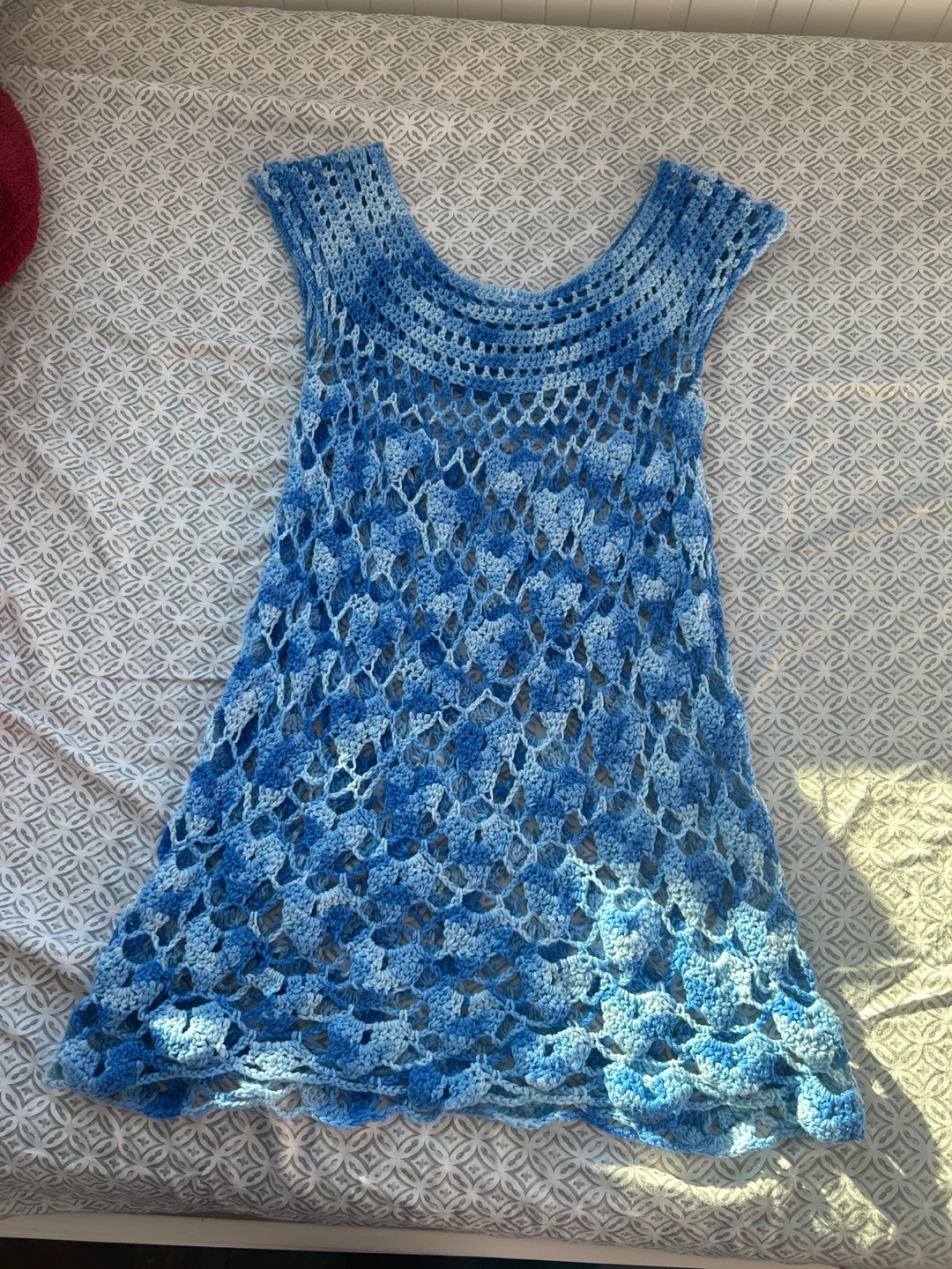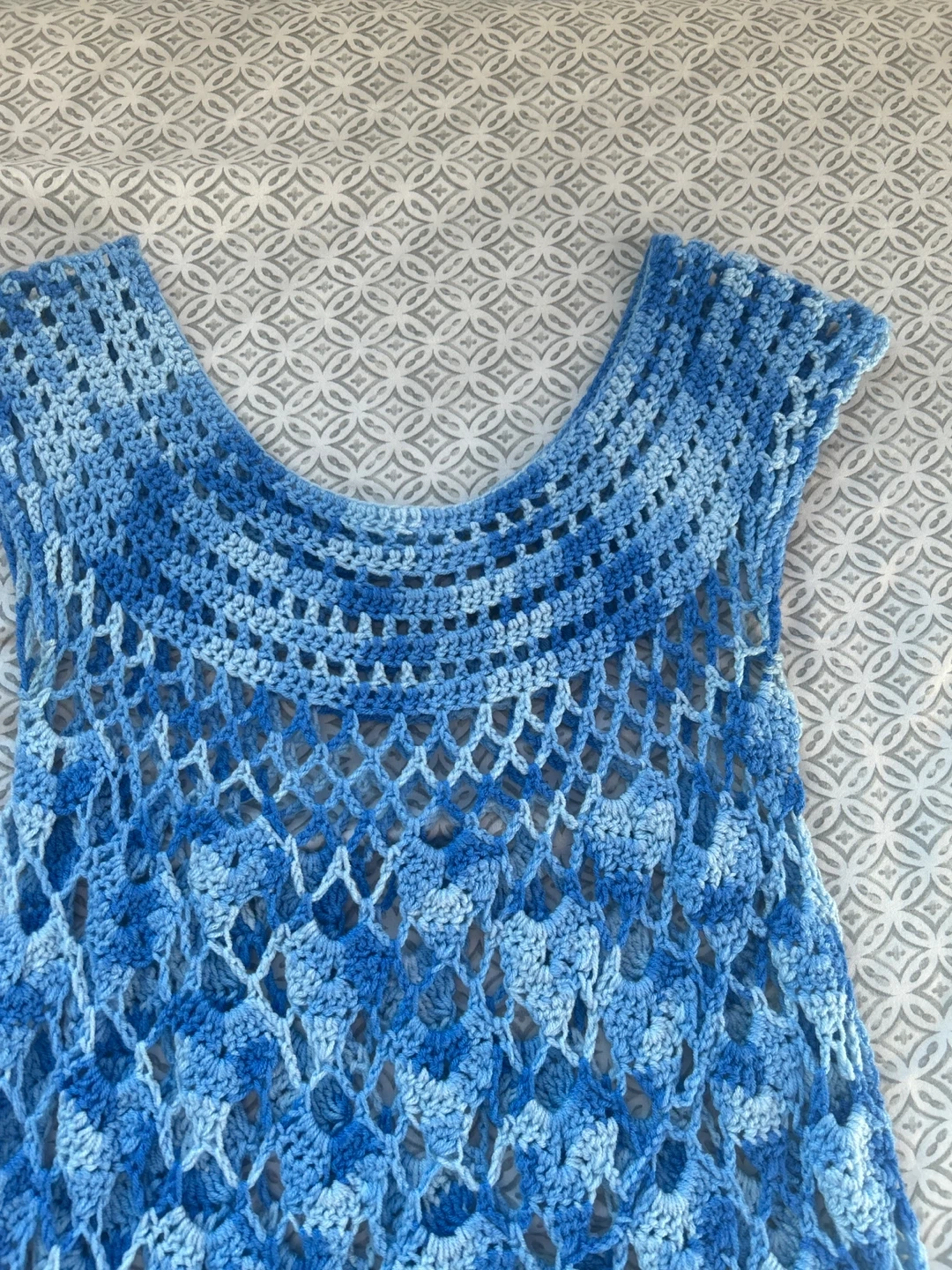 Handmade blue crochet tunic with a sleeveless design. Features a lovely ombre blue colour. This is a great piece for layering or can be used as a cover up!