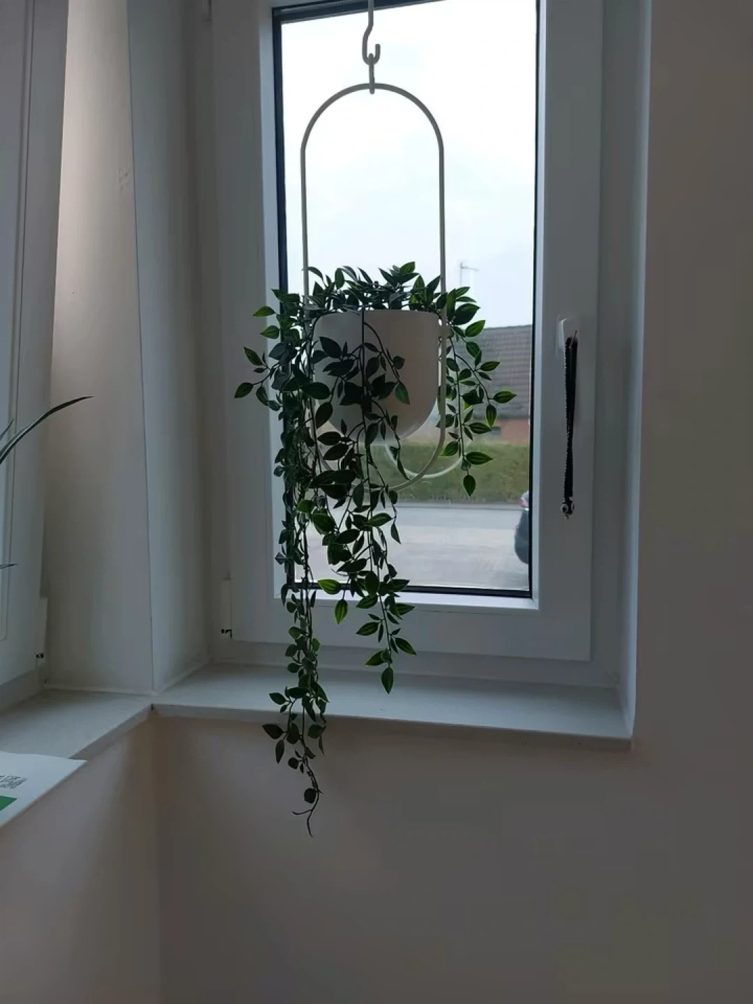 This artificial hanging plant features lush green leaves cascading from a white pot. It's designed with a metal hanger for easy display. Great for adding a touch of greenery without the upkeep!