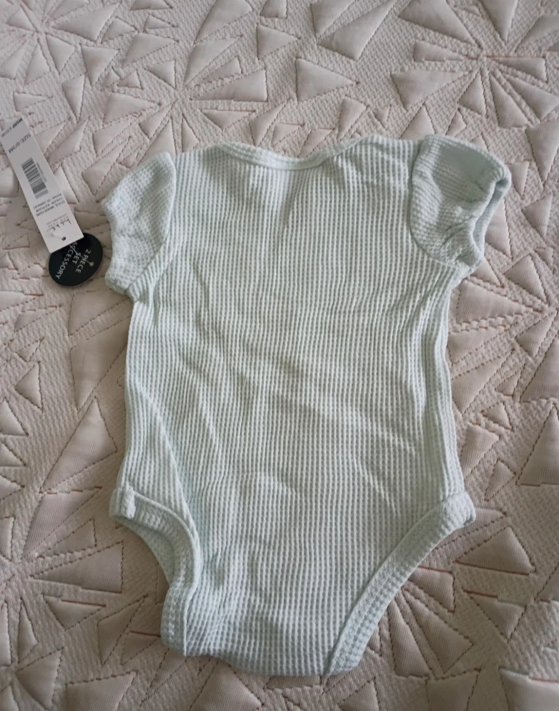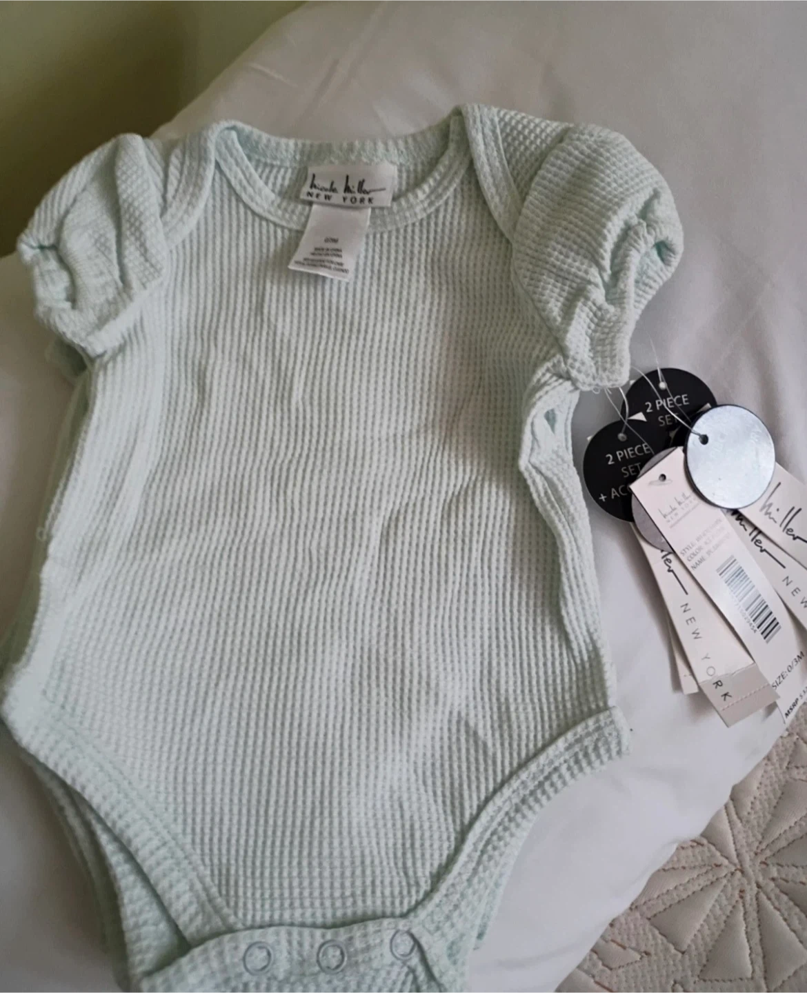 This is a light blue waffle knit bodysuit from Nicole Miller New York. It's a size 0-3 months. It has short sleeves and snaps at the bottom for easy changes.
