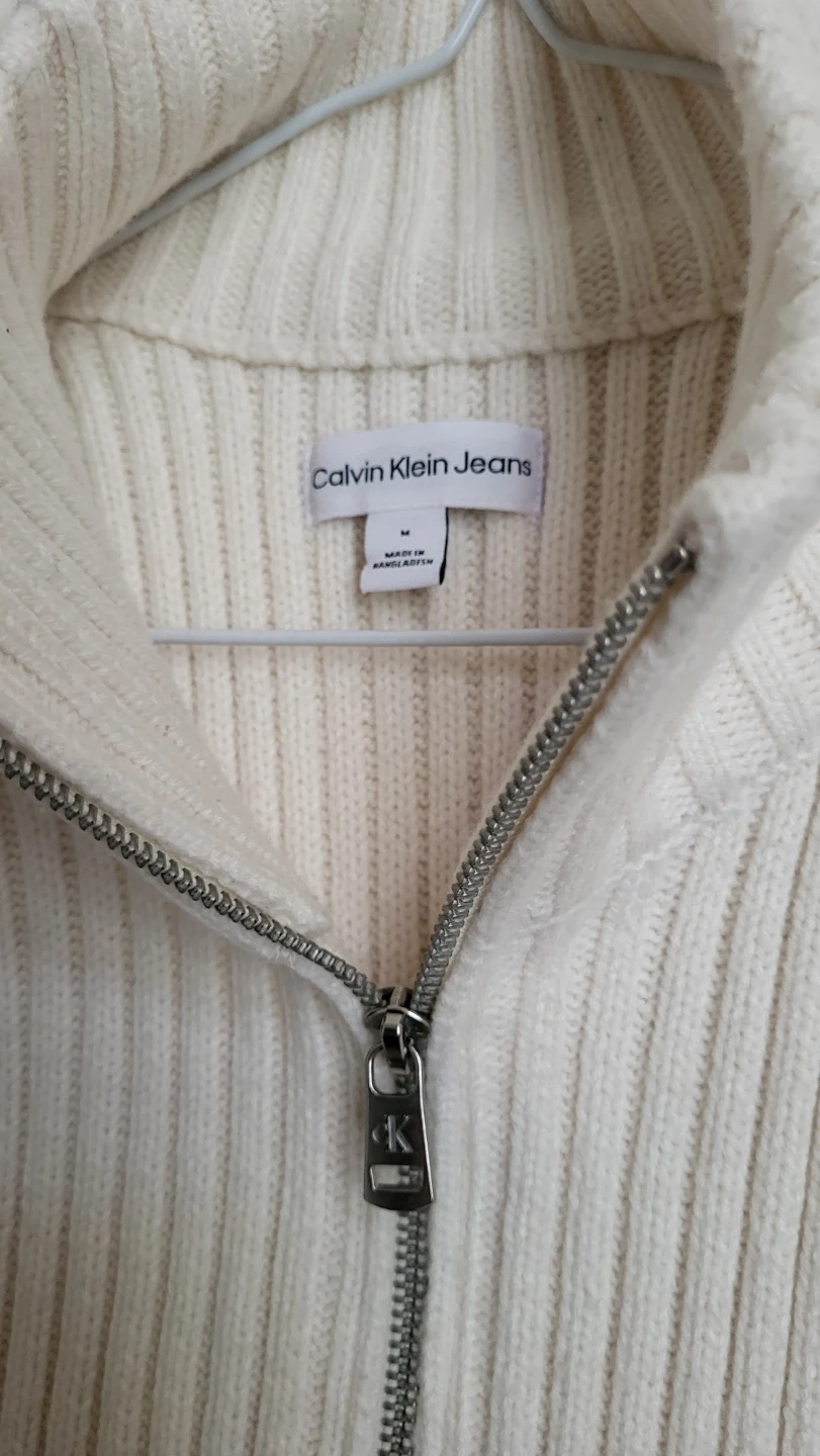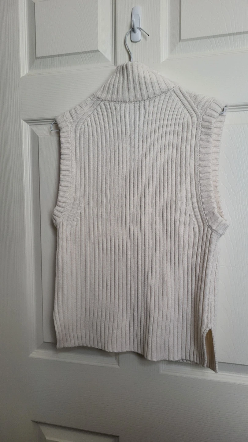 Cream-coloured sweater vest from Calvin Klein Jeans. It features a mock neck and a quarter-zip front. Ribbed knit material. Size Medium, fits S-M.