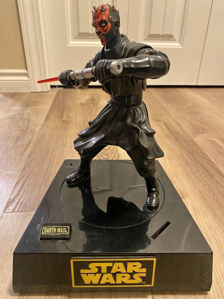 Large Darth Maul Star Wars display figure in great condition. Features Darth Maul in an action pose with his double-bladed lightsaber, mounted on a sturdy black Star Wars base with nameplate. Perfect for collectors, man caves, movie rooms, or Star Wars fans.