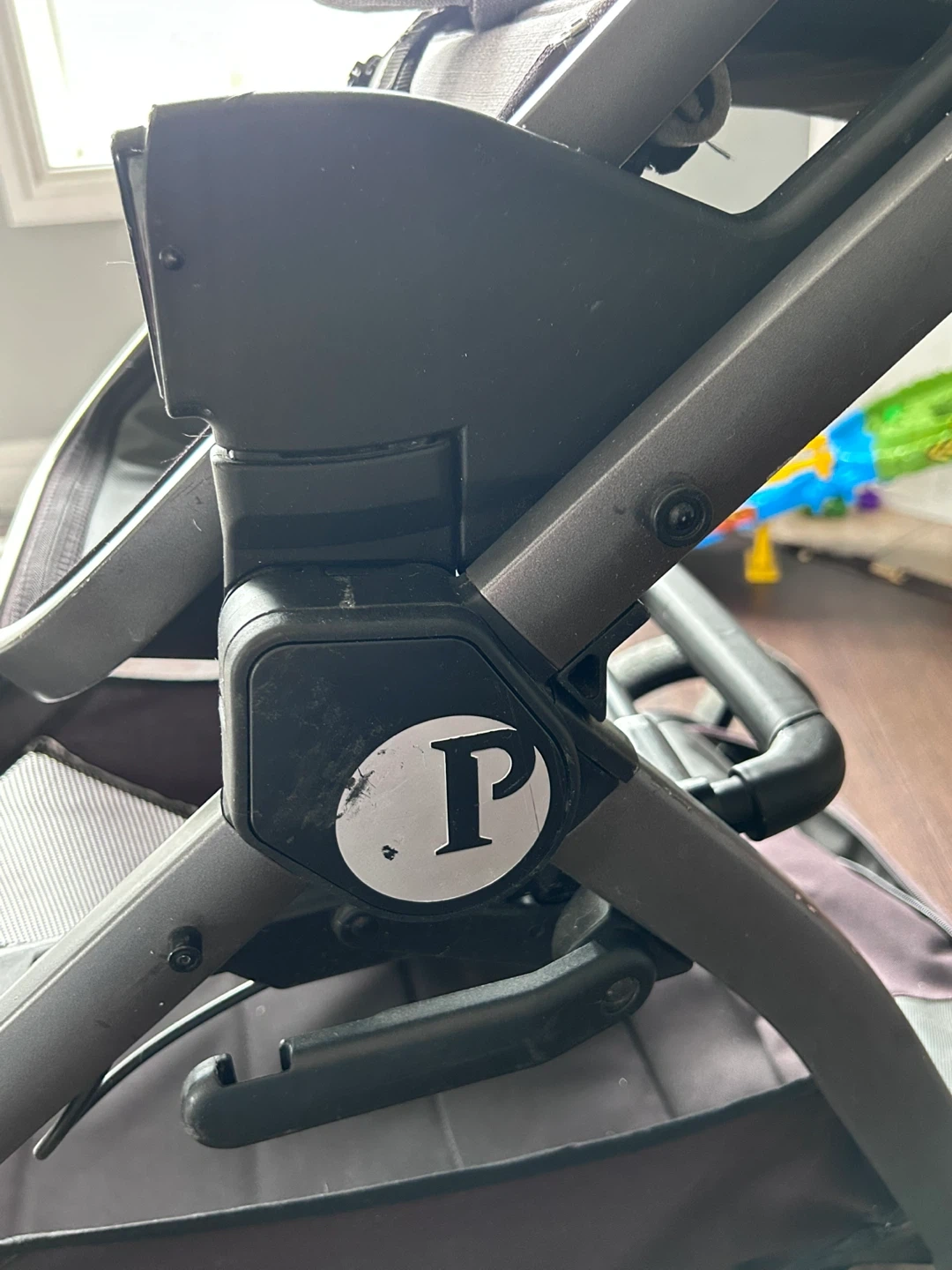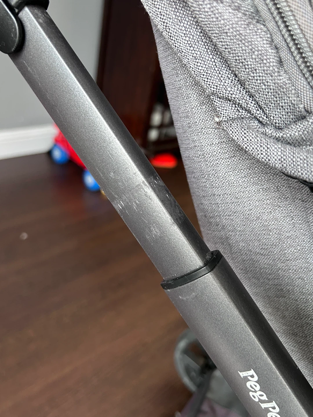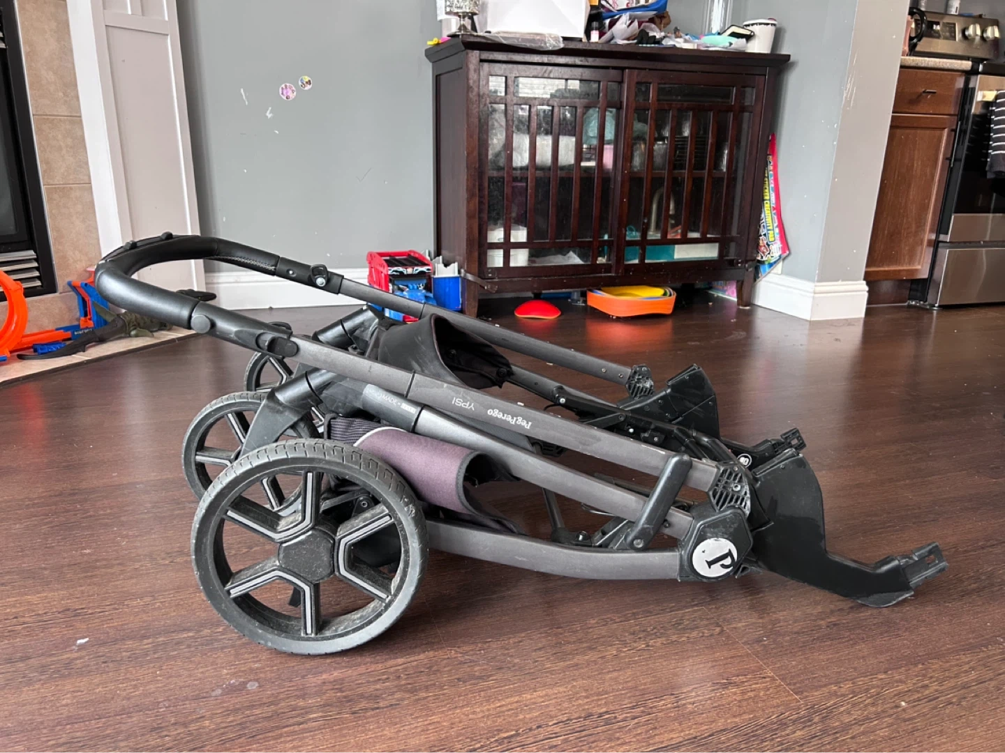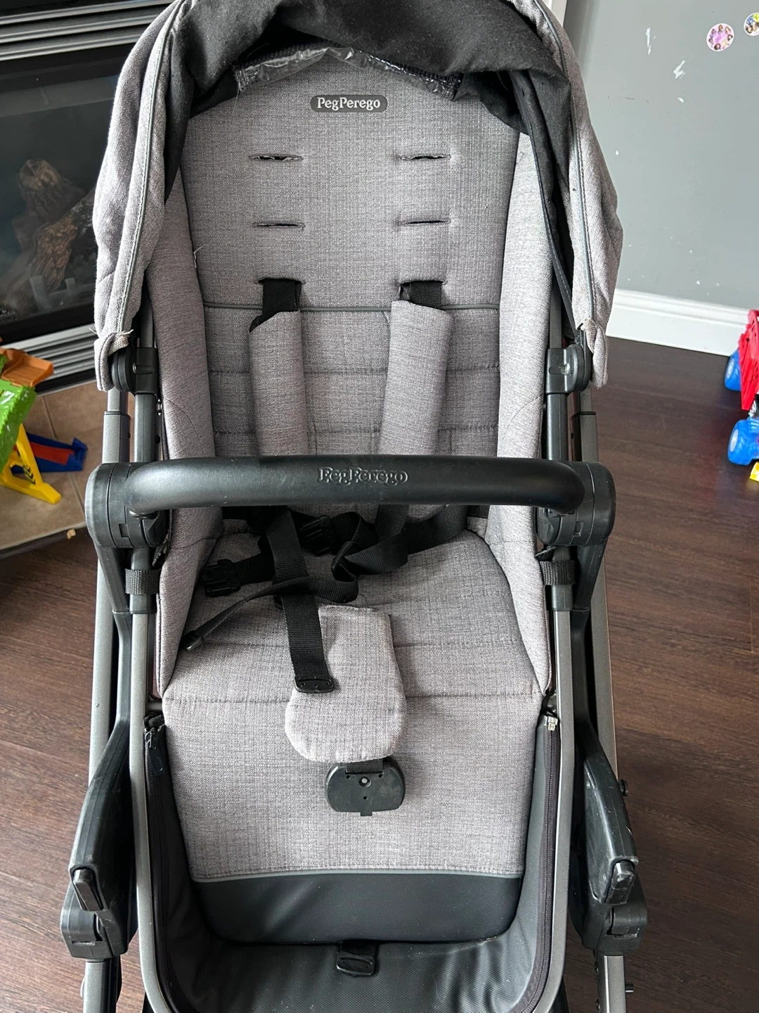 Grey Peg Perego stroller with adjustable handle and large storage basket. It's a comfortable and convenient option for getting around with your little one. The seat reclines for napping.