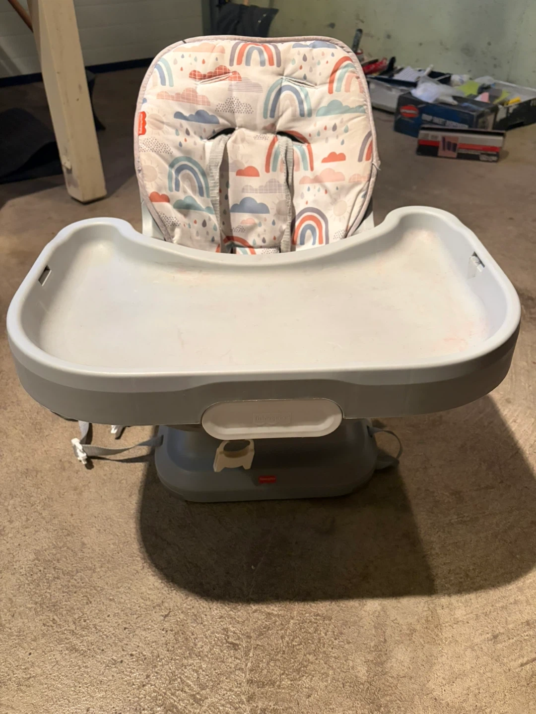 Fisher-Price booster seat with a fun rainbow and cloud print cushion. It has a removable tray for easy cleaning. This seat securely attaches to a dining chair.