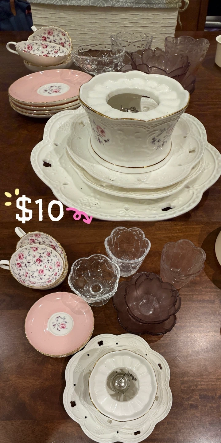 A collection of decorative teacups, small dishes, and clear and purple glass bowls. Includes floral patterned teacups and pink saucers. Some pieces have ornate detailing.