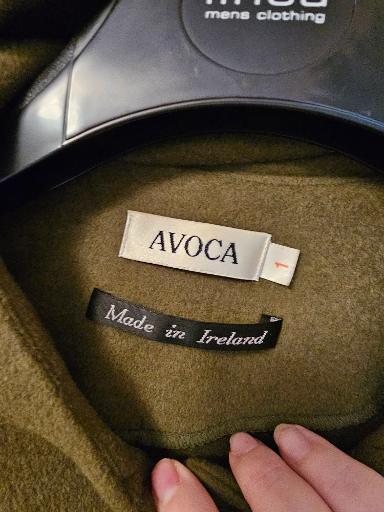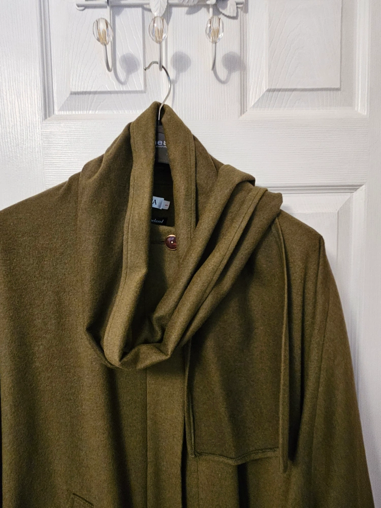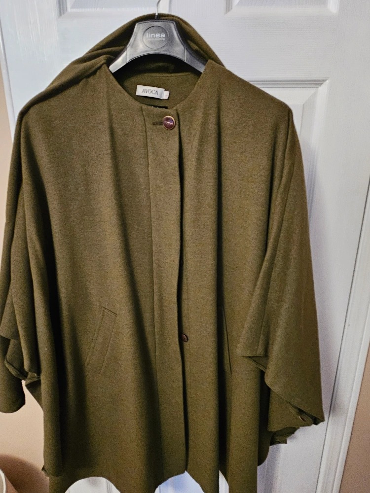 30Olive green irish wool cape. Features a high collar and button closure. Made in Ireland. Size 1.