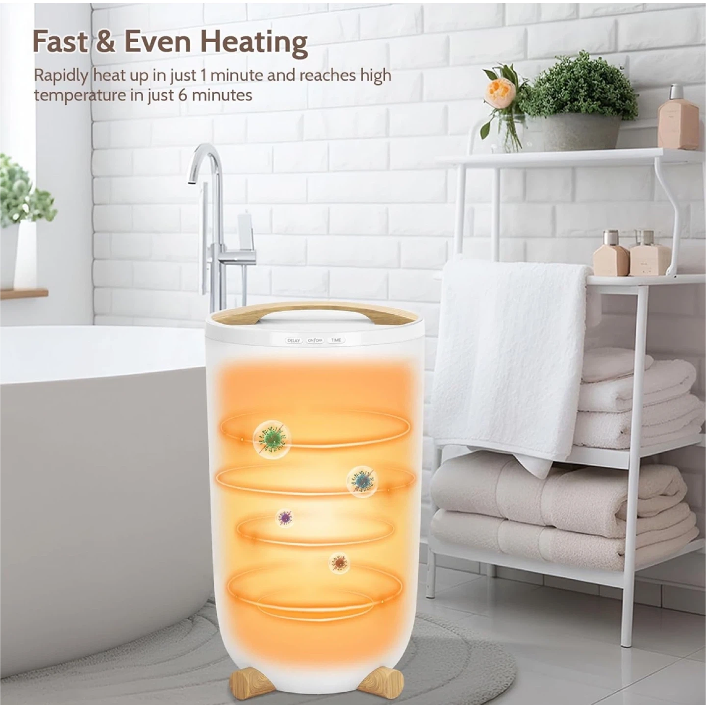 Adjustable Heating & Delay Timer: The hot towel warmer offers rapid heat up in just 1 minute and reach high temperature in just 6 minutes. The towel warmer bucket is set in up to 24-hour delay timer. Always have warm towels ready by using the built-in timer to heat your towels for 15, 30, 45 or 60 minutes before automatically shutting off. whether you're taking a quick shower or long, relaxing soak, the warmer suits all your need, use it with more confidence!