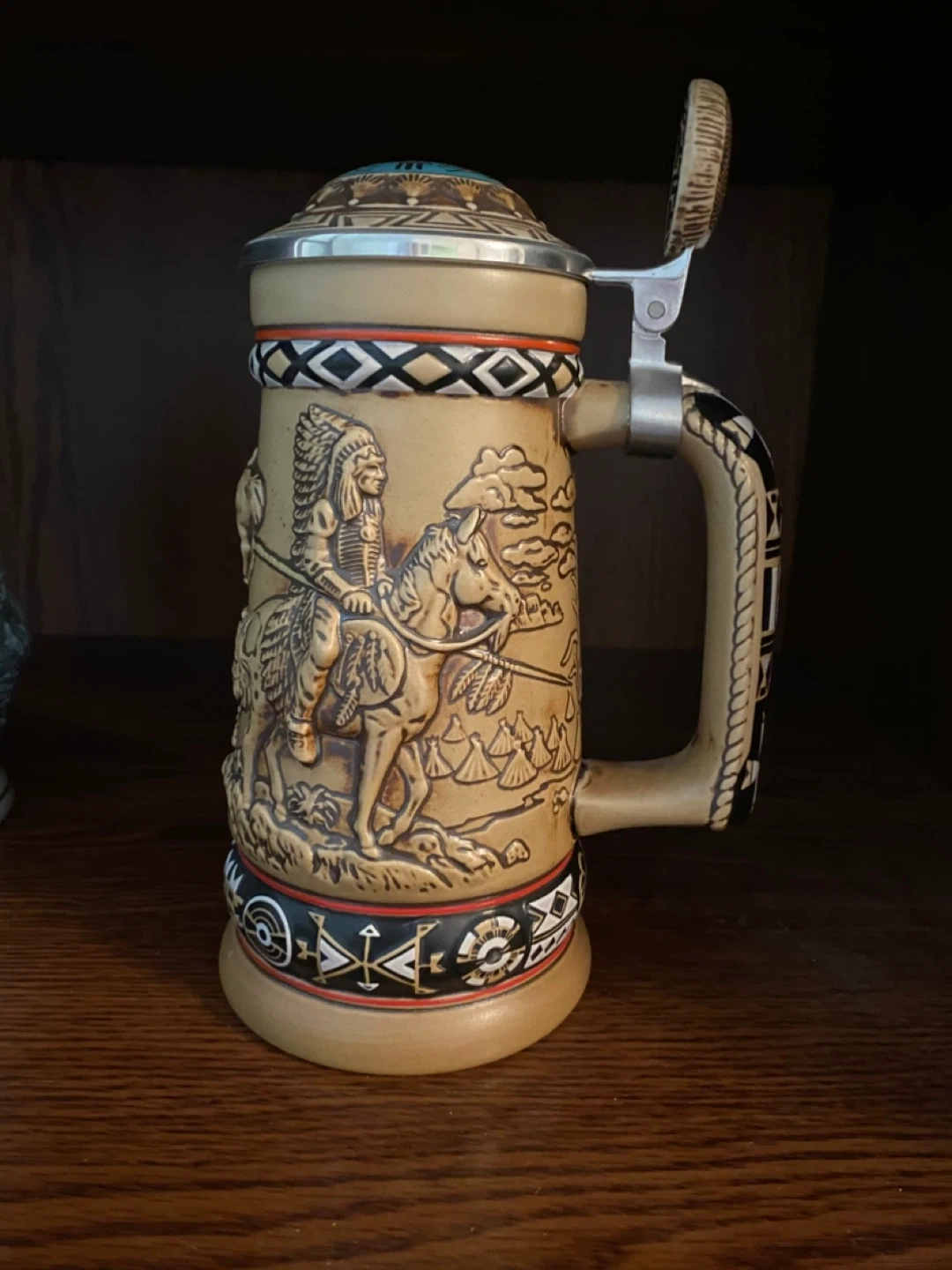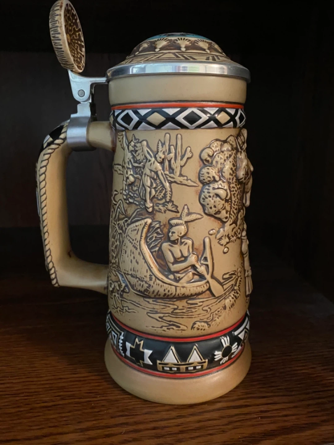 10Selling an Avon Canada North American Indian Stein. It's a handcrafted stein from Brazil, featuring detailed depictions of North American Indigenous people and scenes. It's a unique piece for collectors or anyone interested in vintage decor