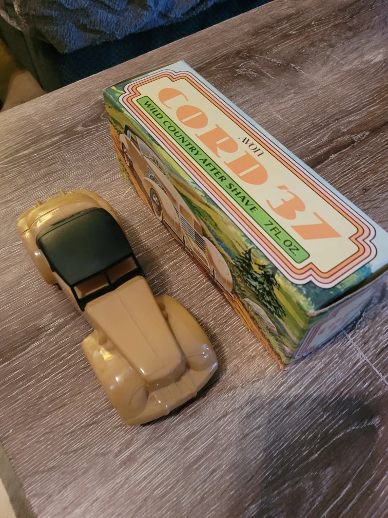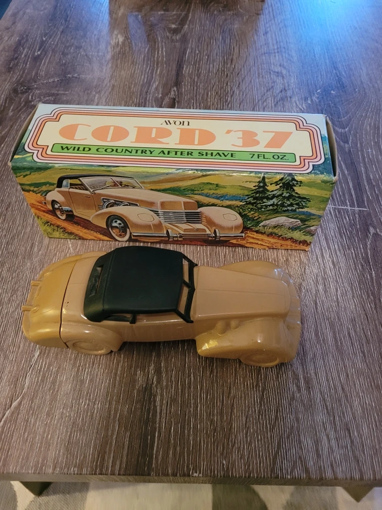 138Selling a vintage Avon Cord 37 Wild Country After Shave. It comes with the original box. The bottle is shaped like a car and contains 7 fl. oz. of aftershave.