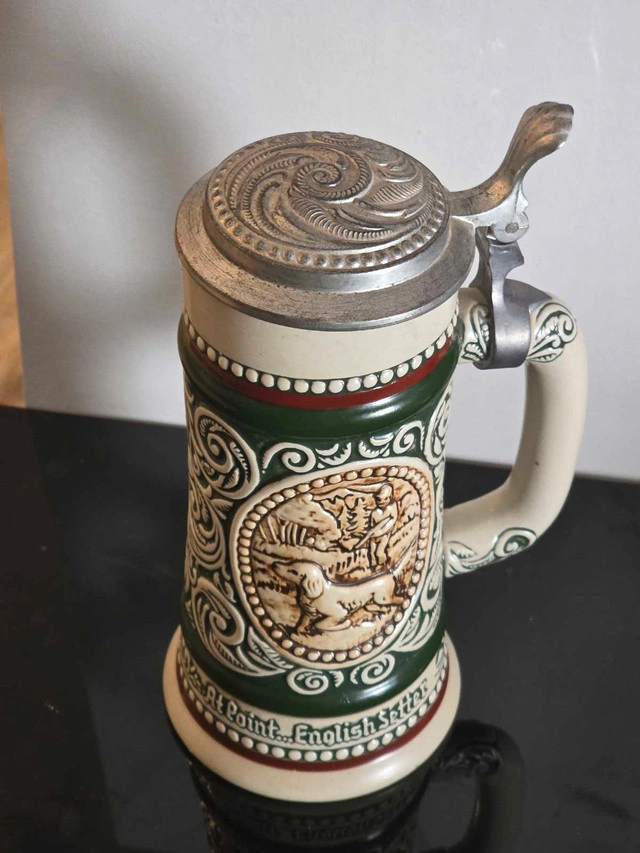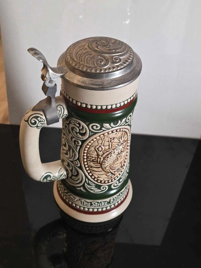 59I have listed a number of beer stein. Buy two and get 25% off both. Buy three and get 35% off all. BUY 4 OR MORE and get 50% off all. This is an Avon German Stein from 1978, handcrafted in Brazil exclusively for Avon products. It features a detailed relief design with a pewter lid. It's a wonderful collectible piece in used condition, showing some wear that adds to its vintage charm. Here are the details: * Brand: Avon * Year: 1978 * Origin: Handcrafted in Brazil * Design: German Stein with pewter lid I'm parting ways with this stein to make room for new treasures. If this ad is still up, it means the stein is available, just waiting for a new home.