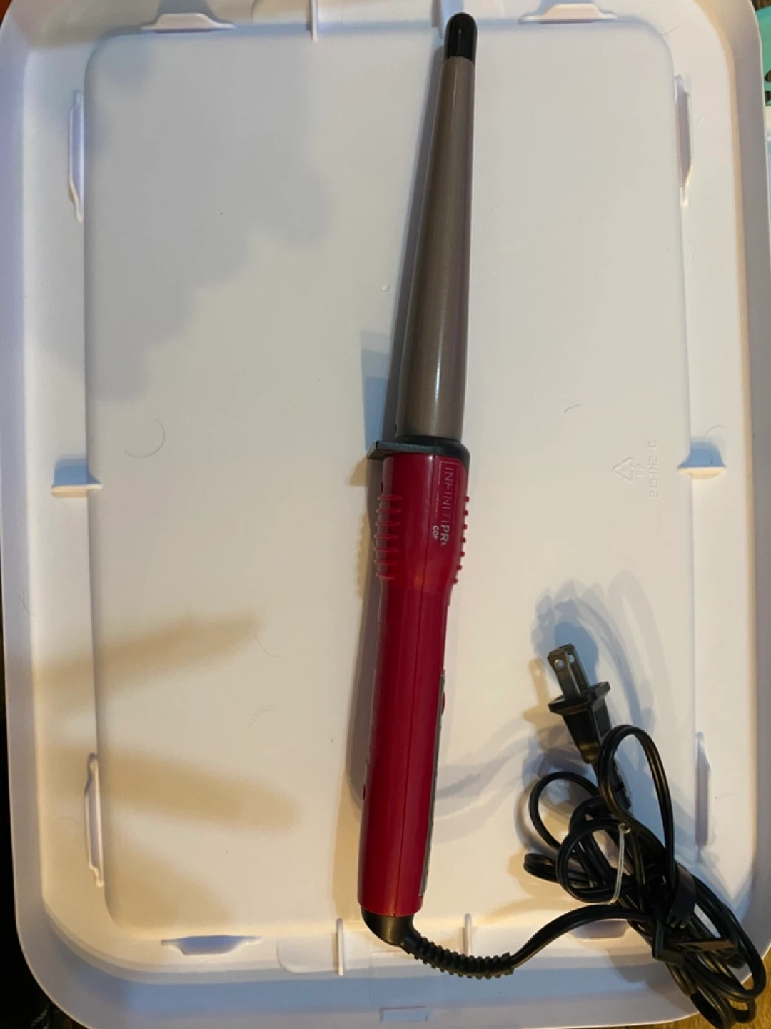 InfinitiPro by Conair tapered curling wand. It has a tapered barrel for creating curls and waves. The wand has adjustable heat settings for different hair types. Includes power cord. Pick up only.