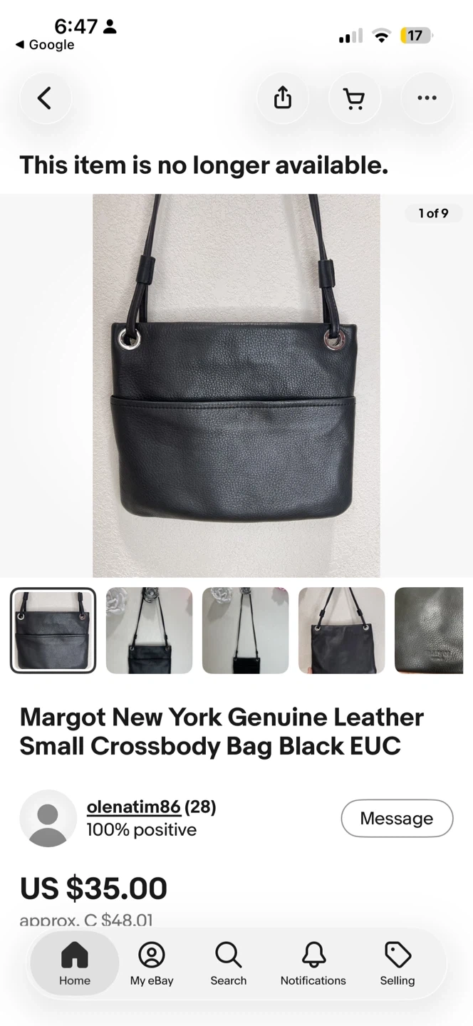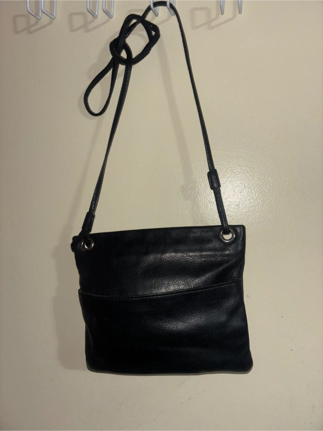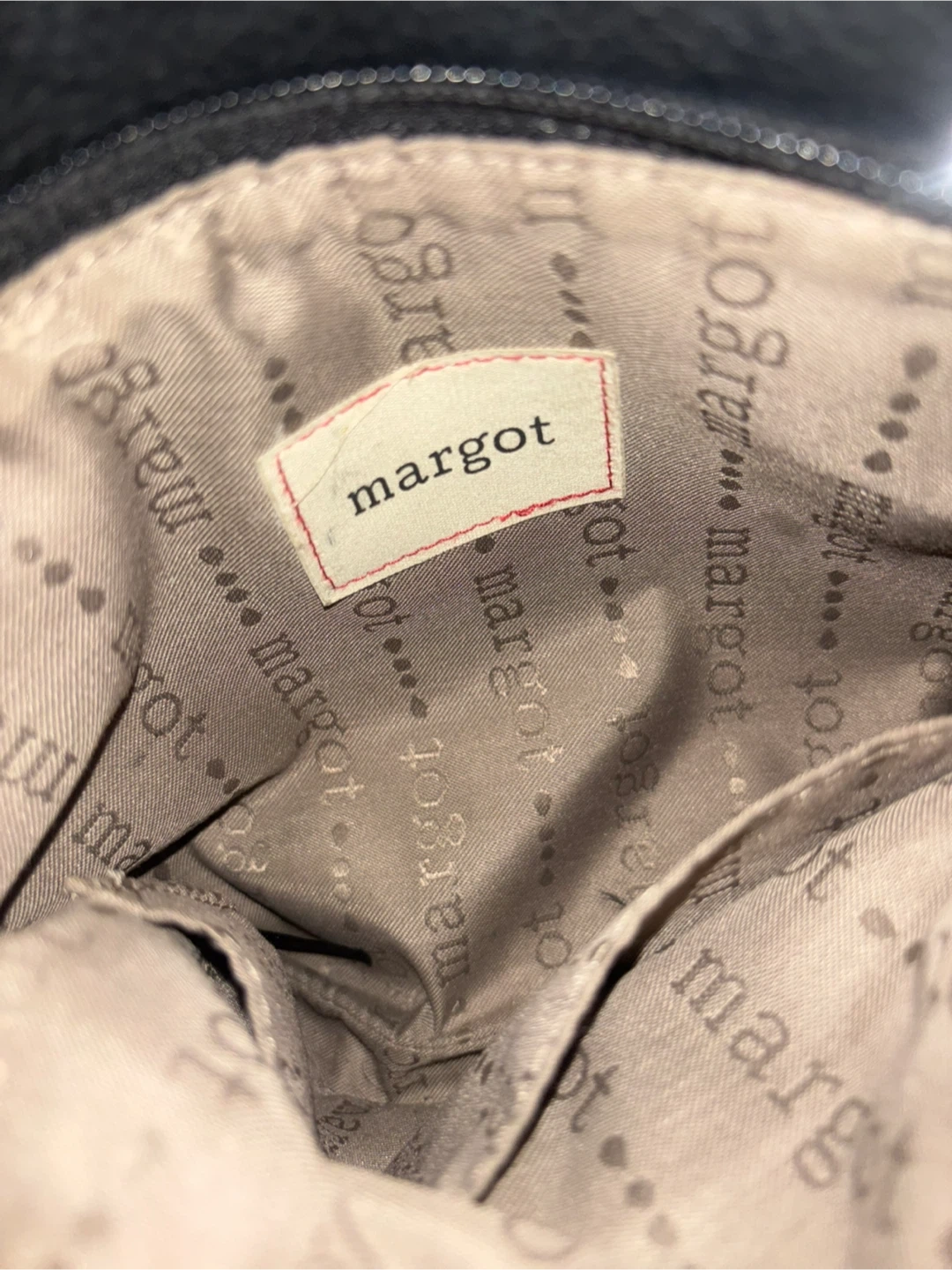This is a black leather small crossbody bag from Margot New York. It's made of genuine leather with a fabric lining. Perfect for carrying essentials when you're on the go!
