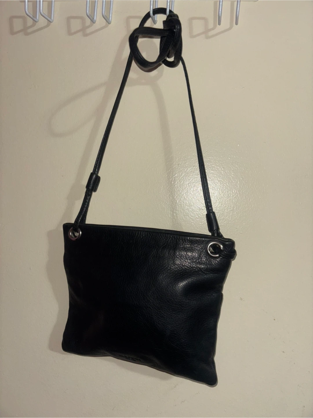 This is a black leather small crossbody bag from Margot New York. It's made of genuine leather with a fabric lining. Perfect for carrying essentials when you're on the go!
