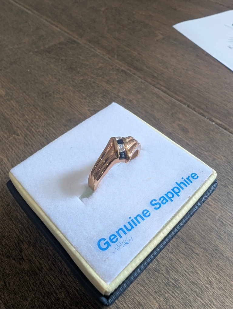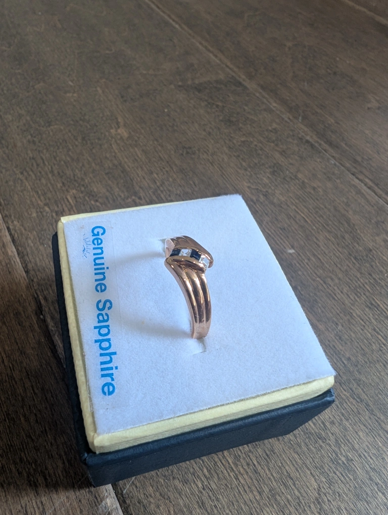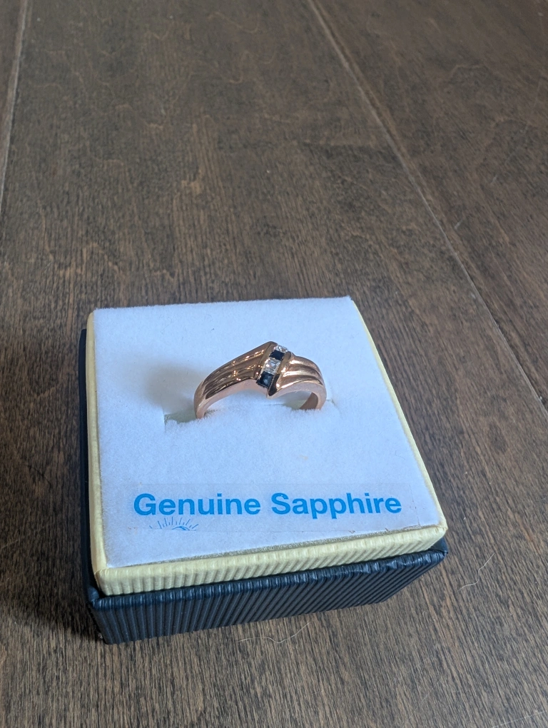Brand new brass metal natural blue sapphire ring for sale. Two channel set square cut natural blue sapphires 0.10 carats with cubic zirconiums 0.16 carats. Ring size 6, September birthstone. Retail value $300, selling for $75 FIRM. Comes with appraisal.