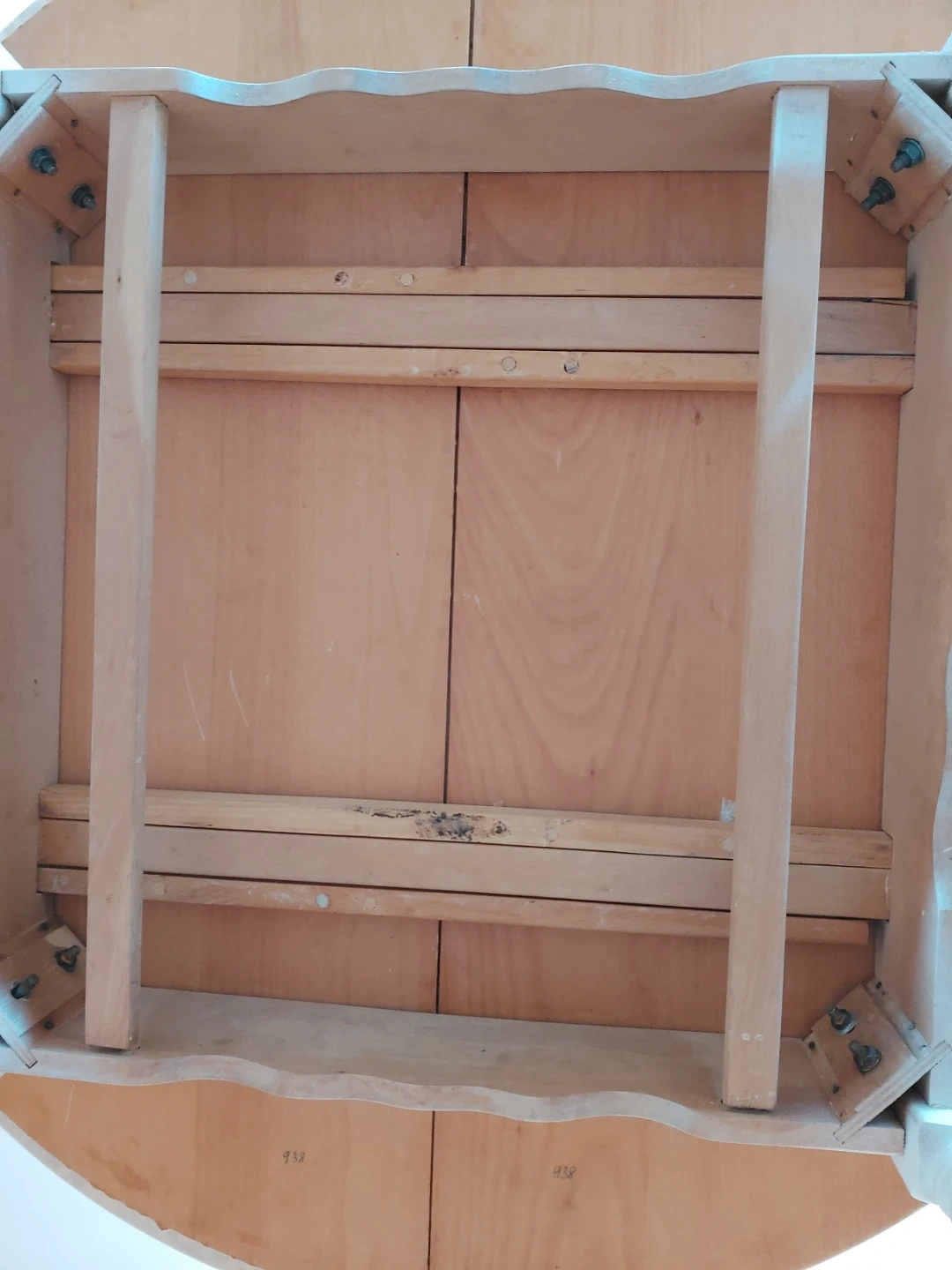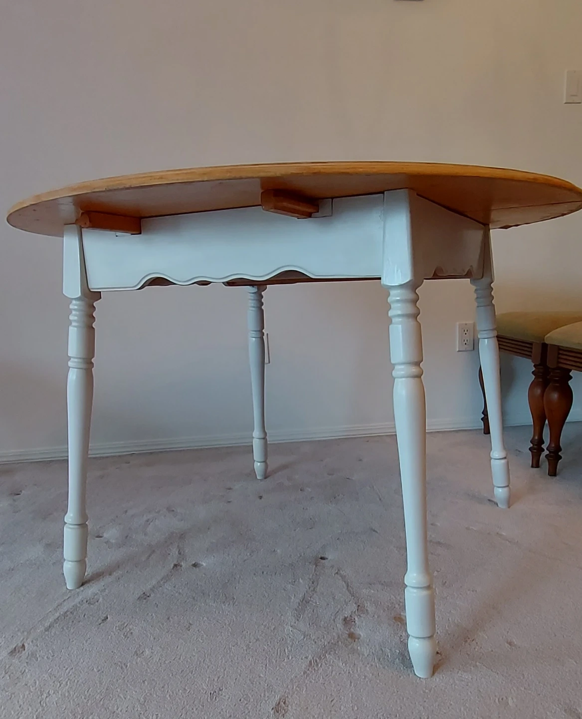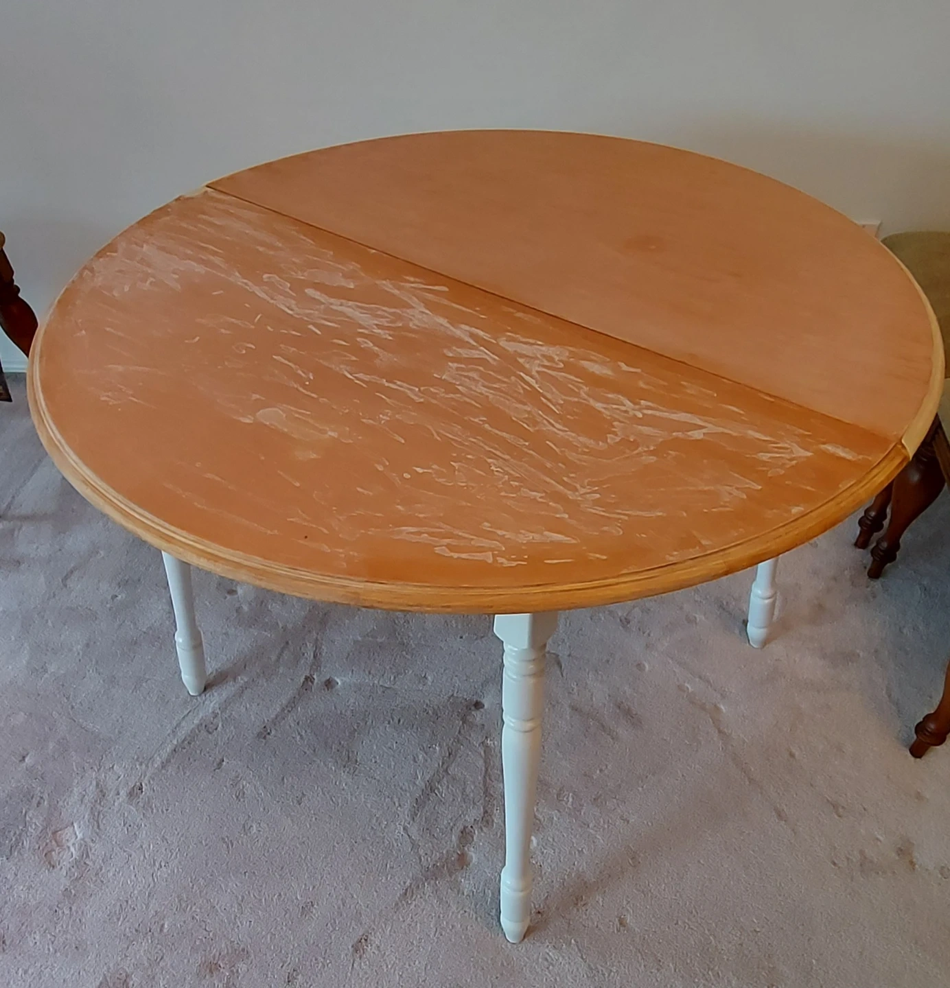 This round drop-leaf table features a light wood top and white legs. It's expandable to accommodate more people. Perfect for smaller dining spaces or as an extra surface. Needs some sanding. No extra leaf.