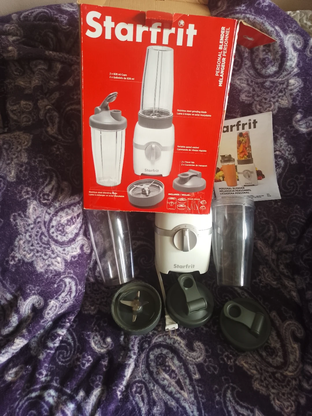 This Starfrit personal blender is great for making smoothies and shakes! It comes with two 20oz cups and two travel lids. Stainless steel grinding blades ensure efficient blending.
