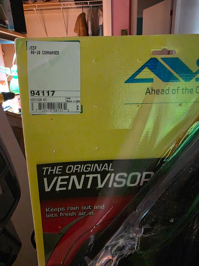 10AVS Ventvisor 94117 06-10 Jeep Commander NEW FITMENT | 2006 - 2010 Jeep Commander CUSTOMIZED FIT | Engineered to fit your vehicle’s year, make, and model, this externally mounted side window deflector features a curved design that hugs the contours of your vehicle and comes in dark smoke or chrome finish for a truly custom look. REFRESH YOUR RIDE | Easily refresh the air in your cab without letting rain or weather in – just crack the window to remove stale, stubborn odors from things like pets, smoking or the kids dirty sports bags. ULTRA-TOUGH | Constructed with high-grade impact-resistant acrylic that’s scratch resistant, car wash safe, and will never fade or discolor from exposure to the sun. Made in the USA with global materials. EASY TO INSTALL | Mounts in minutes using pre-applied 3M automotive- grade adhesive mounting tape (included). OPEN TO ANY AND ALL TRADE OFFERS could be anything Pick Up Sarnia Rd And Western Rd Area