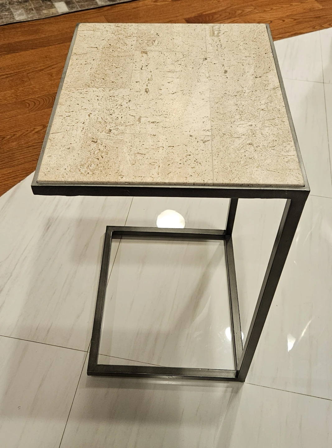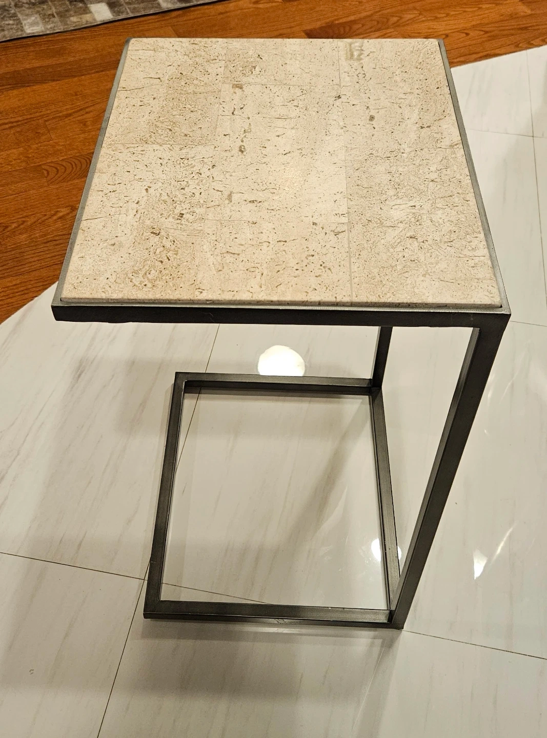 Classic contemporary style accent tables with a travertine marble top and a metal frame with pewter finish. Dimensions for the larger round table is 36"x36"x20".