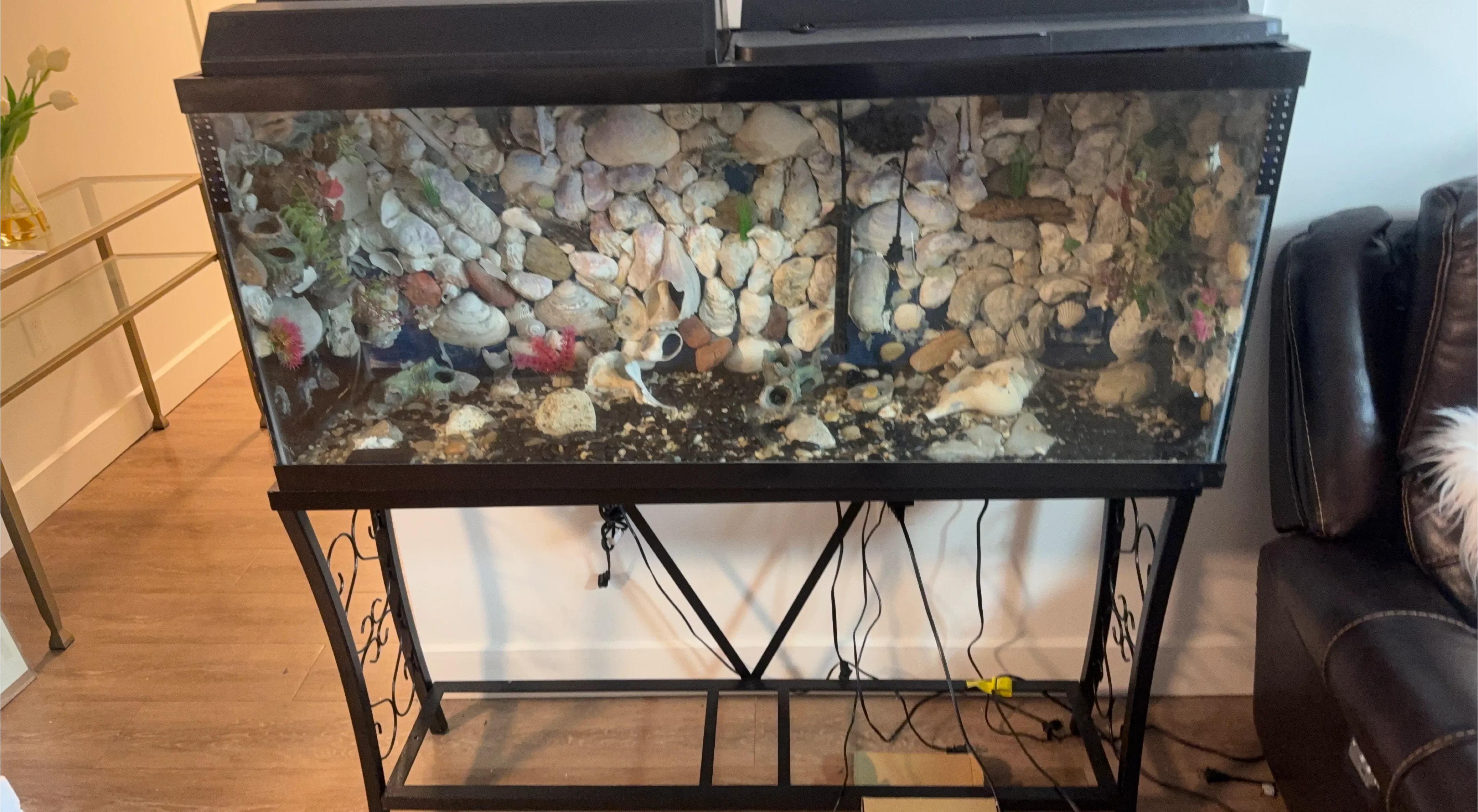 This is a large aquarium, perfect for housing fish or other aquatic pets. It comes with a sturdy black metal stand. The tank is decorated with natural shells and rocks. Great for a beginner or experienced aquarist!